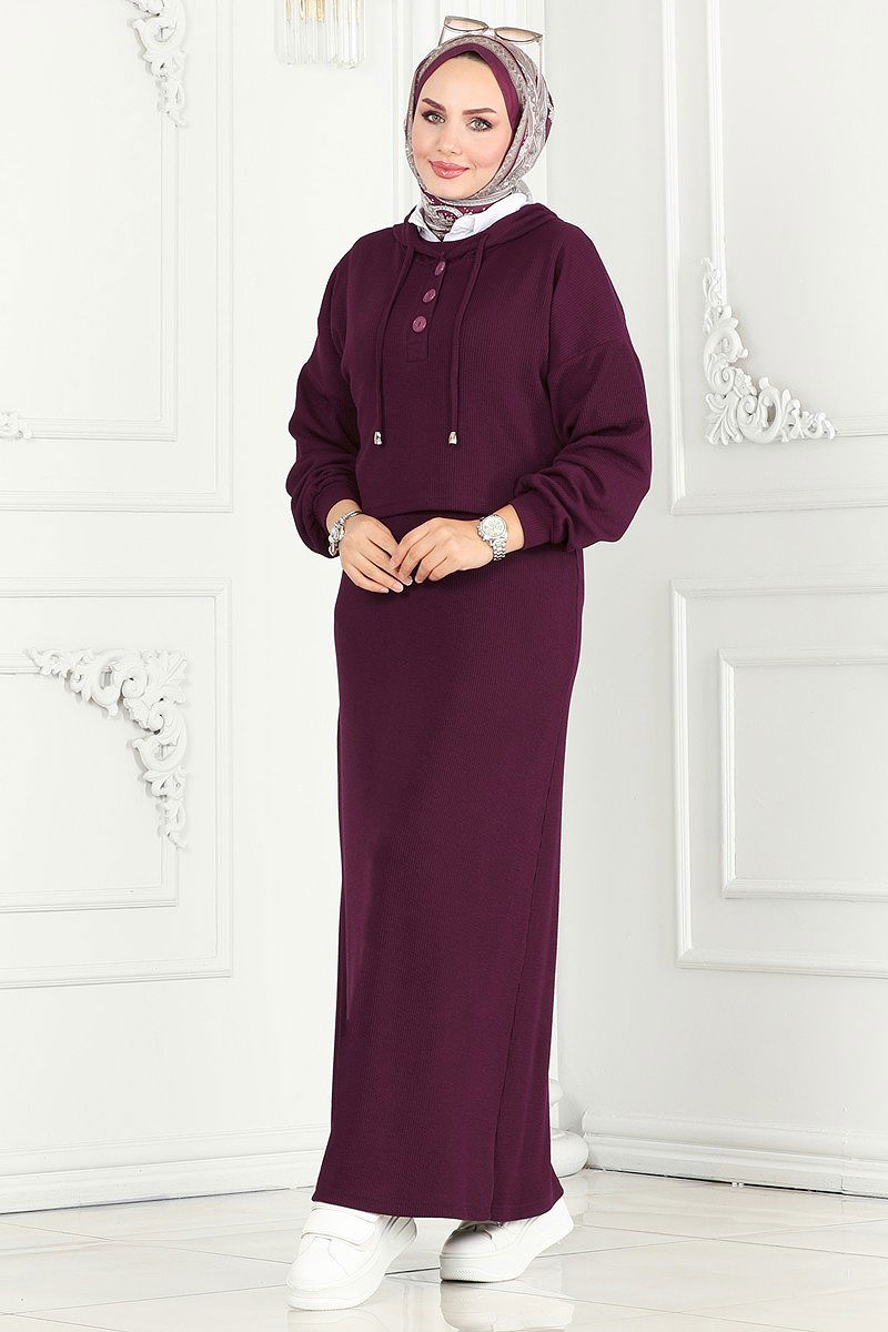 Bolero Detailed Winter Suit model is a hijab product. It can be used in Autumn and Winter seasons. It should be washed at 30 degrees without squeezing. It is made of first-class twist fabric. The product has a hooded collar. The product can be used from the front and is half-buttoned. It is unlined. (The product on the model is size 38.) The inner dress is worn from the head. The inner dress is sleeveless. The hood is sewn to the product.