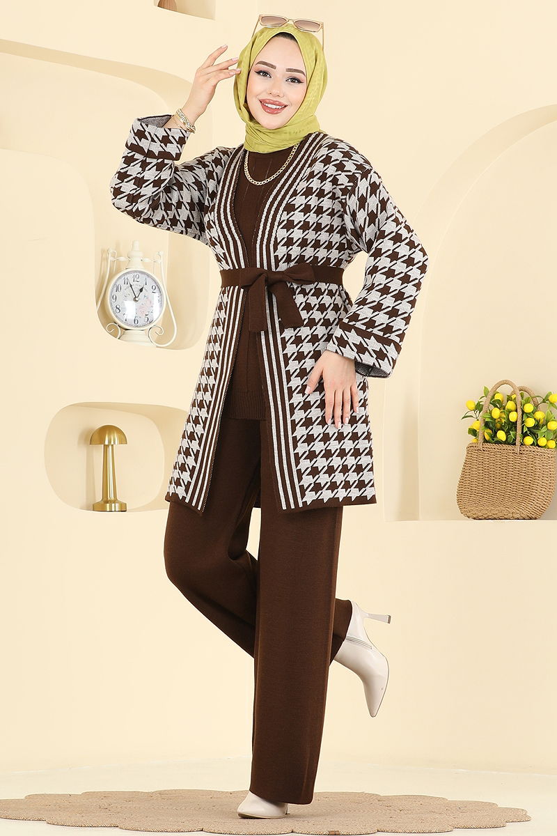 Specially designed for the Autumn and Winter months, the Belt-Detailed Triple Set stands out with its elegant and modern design. This hijab set offers a comfortable and stylish look, made from knit fabric and suitable for delicate washing at 30 degrees. The product features a turtleneck collar and is unlined, presented in a standard size. The inner blouse is sleeveless, the sleeves are detailed with sewn fold cuffs. The belt designed to prevent waviness is optional and complements the outfit. The elastic waist of the trousers ensures comfort. This elegant set is perfect for both everyday wear and special occasions.