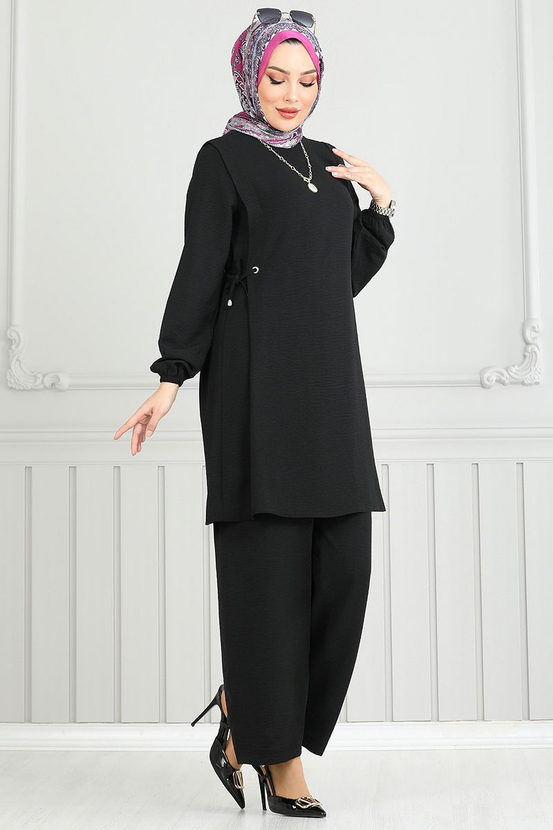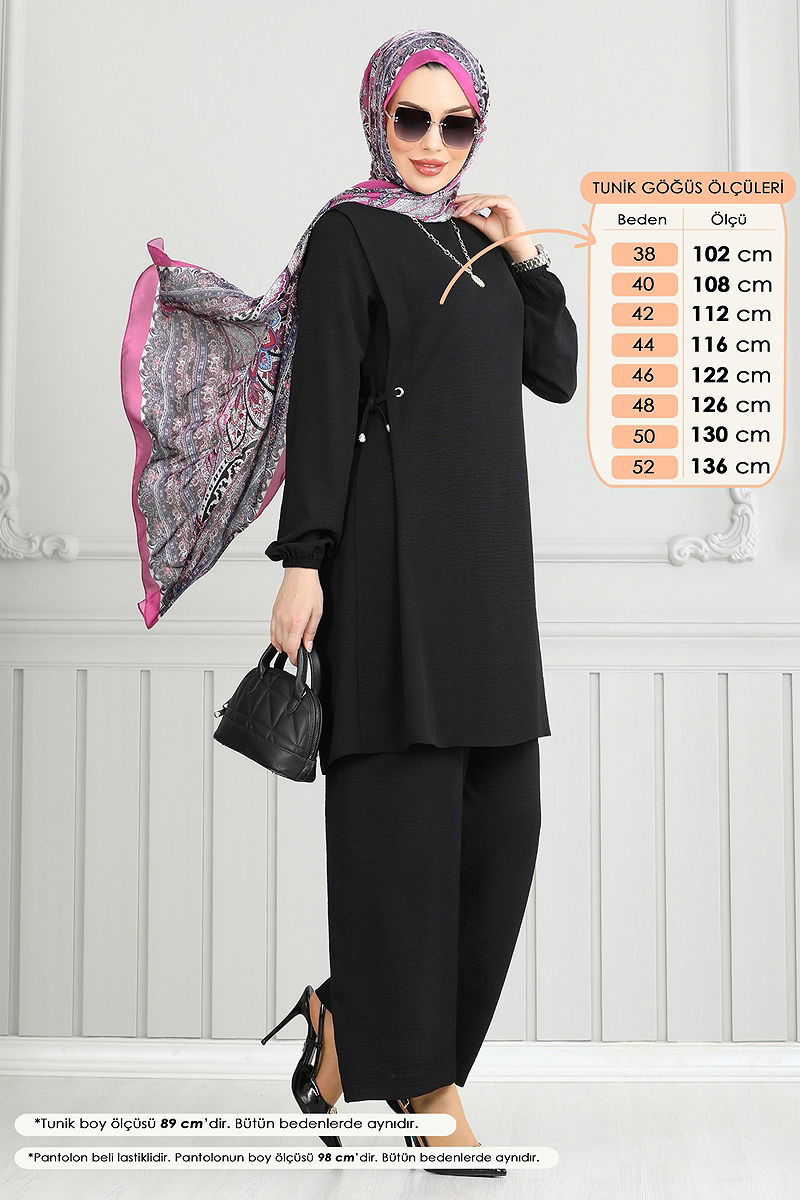 The Beli Bağcıklı Tesettür Suit is a versatile Islamic clothing option suitable for all seasons, made from aerobin fabric. Its design features a back zipper and adjustable waist ties, combining style with practicality. The suit offers comfort with its crew neck and unlined design, while its elastic waistband and cuffs on the trousers ensure a perfect fit. It is suitable for gentle washing at 30 degrees.