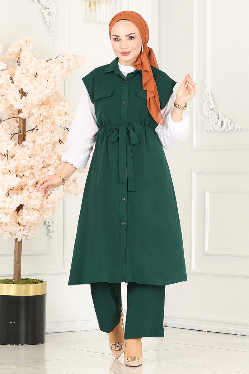 The Belted Tunnel Aerobin Set is a stylish and comfortable clothing set designed specifically for modest fashion. It is suitable for use in spring and summer. Due to the delicate fabric structure, it is recommended to be washed at 30 degrees. With a shirt collar detail, this suit offers ease of use with its buttoned design. Its trousers have an elastic waistband, providing a comfortable fit throughout the day. The vest and trousers are completed with chic and practical pocket details. This elegant combination offers practical and stylish solutions for modern modest wear.