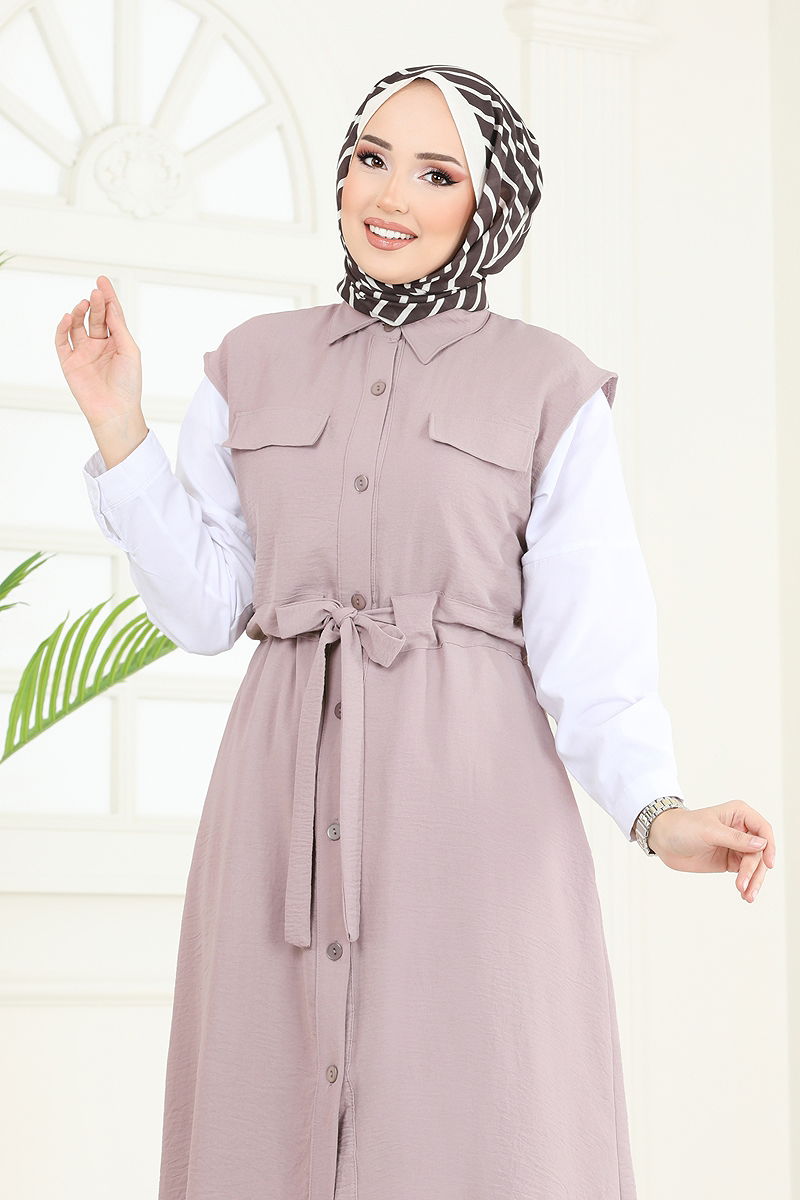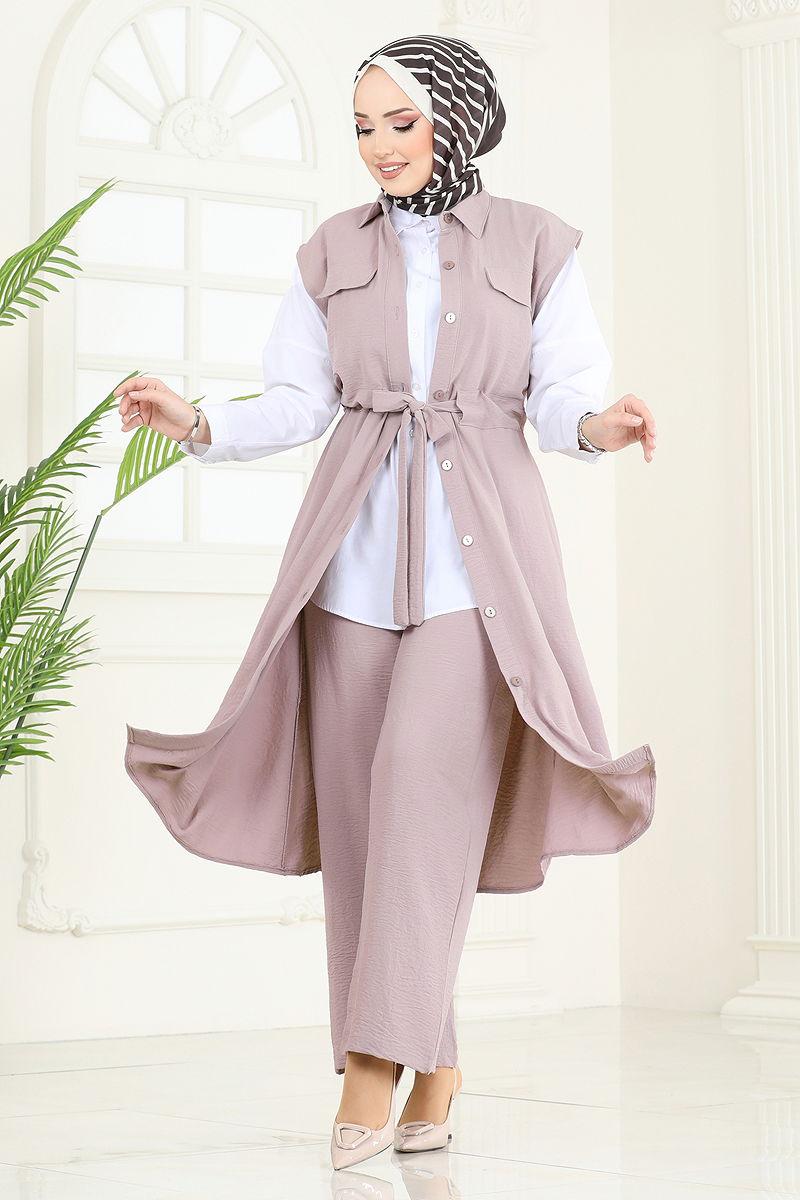 The Belted Tunnel Aerobin Set is a stylish and comfortable clothing set designed specifically for modest fashion. It is suitable for use in spring and summer. Due to the delicate fabric structure, it is recommended to be washed at 30 degrees. With a shirt collar detail, this suit offers ease of use with its buttoned design. Its trousers have an elastic waistband, providing a comfortable fit throughout the day. The vest and trousers are completed with chic and practical pocket details. This elegant combination offers practical and stylish solutions for modern modest wear.