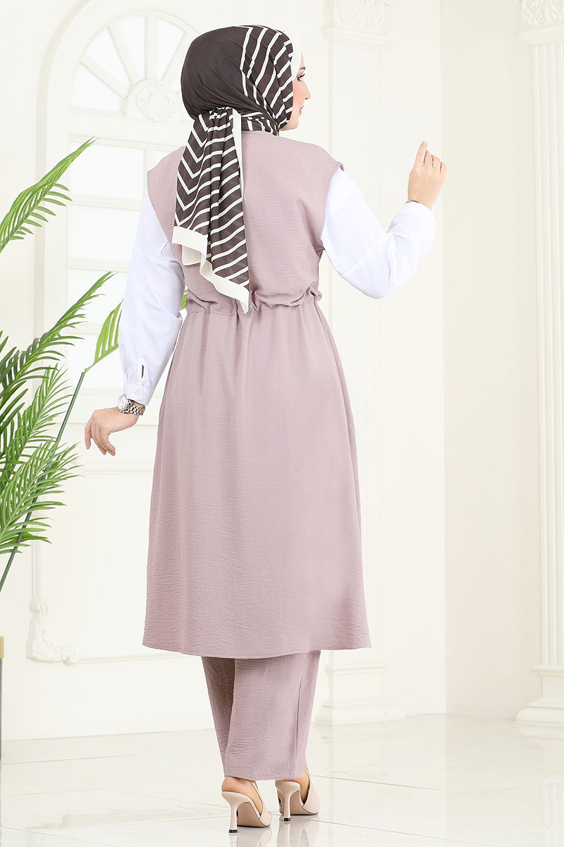 المنتج لديه ياقة القميص. المنتج به أزرار من الأمام. غير مبطنة. البلوزة غير متضمنة. صُنعت عينة من المجموعة مع البلوزة لإظهار الاستخدام المقصود للمنتج. تفاصيل الجيب من الملحقات. خصر البنطال مرن. يتميز بخصر بأربطة على الخصر. قد يكون هناك اختلاف في الدرجة اللونية في المنتج بسبب التقاط الصور الفوتوغرافية.