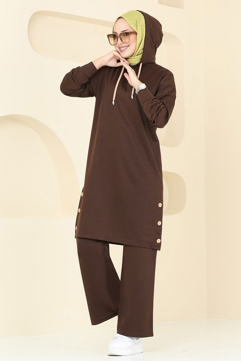 المنتج لديه ياقة مع قبعة. الازرار الموجود بالفتحات اكسسوار. غير مبطنة. تم خياطة القبعة مع المنتج خصر البنطال مرن. قد يكون هناك اختلاف في الدرجة اللونية في المنتج بسبب التقاط الصور الفوتوغرافية.