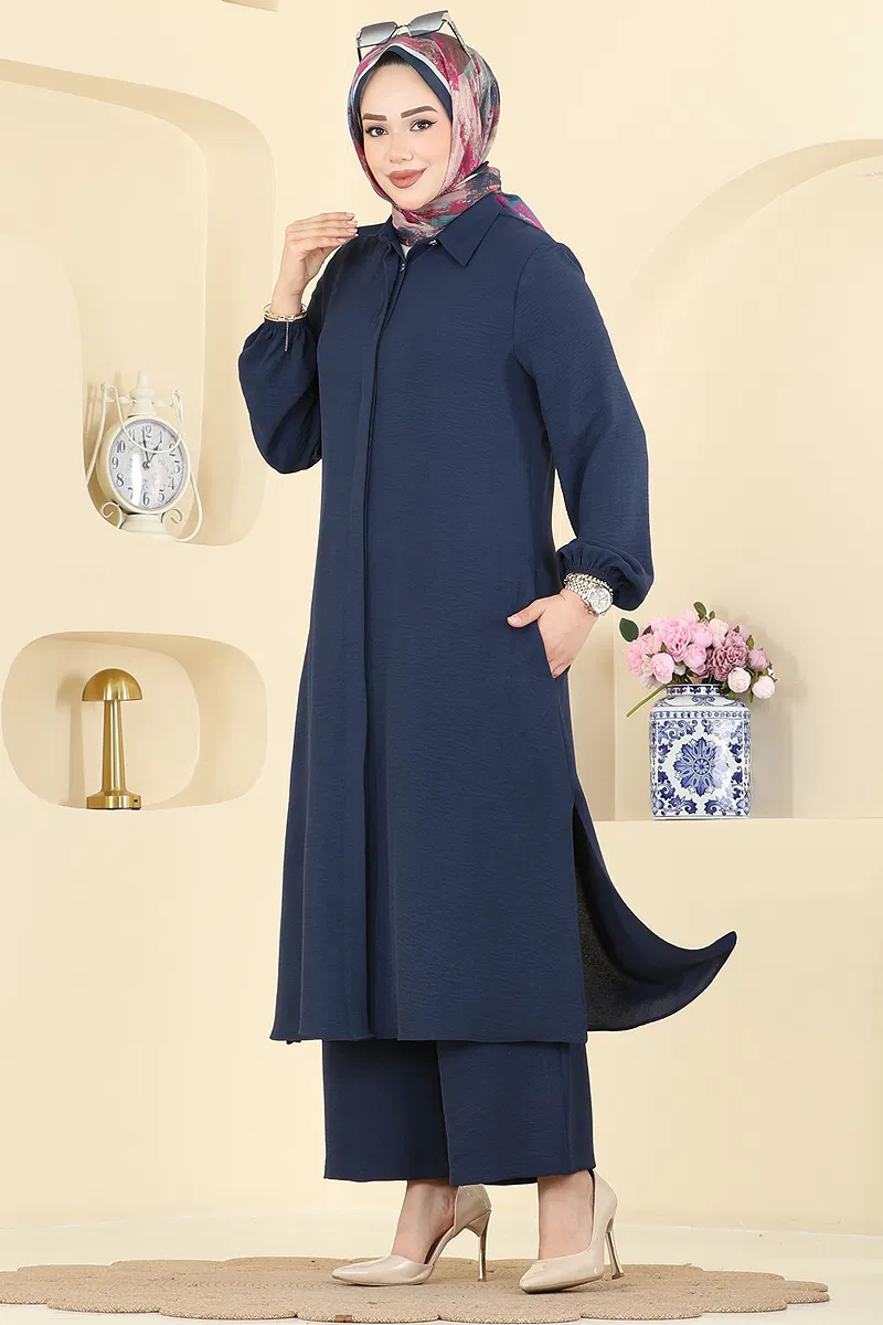 The Buttoned-Front Duo Set, with its KOMBIN model, brings together modern design and comfort. Suitable for all seasons, this modest wear is made from Aerobin fabric and is distinguished by its lightweight structure. The set enhances elegance with its shirt collar and front button details, while the side-slit tunic adds a unique touch. The pants have an elasticated waist with pockets, and elasticated cuffs. It can be washed delicately at 30 degrees Celsius. This KOMBIN duo set ensures you look chic and stay comfortable in any setting.