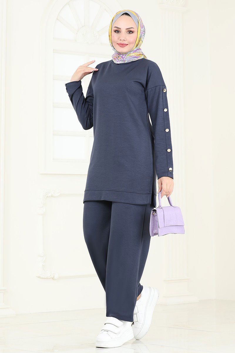المنتج لديه ياقة مرتفعة. البلوز تحتوي على فتحة. غير مبطنة. الأزرار هي إكسسوارات. خصر البنطال مرن. قد يكون هناك اختلاف في الدرجة اللونية في المنتج بسبب التقاط الصور الفوتوغرافية.