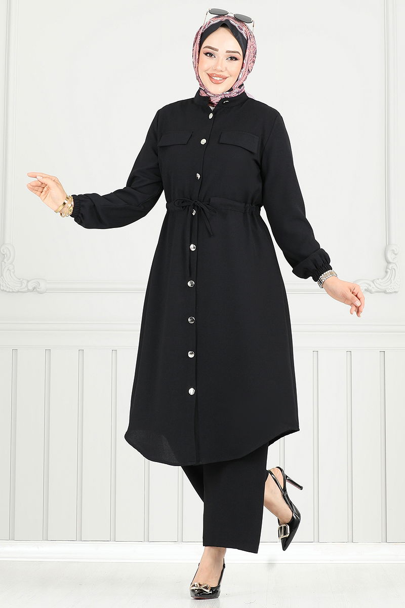 يتميز بخصر ذو أربطة. المنتج لديه ياقة نصف بيضوية. المنتج به أزرار من الأمام. غير مبطنة. البلوزة غير متضمنة. صُنعت عينة من المجموعة مع البلوزة لإظهار الاستخدام المقصود للمنتج. تفاصيل الجيب عبارة عن إكسسوارات. خصر البنطال مرن. السوار مطاطي. قد يكون هناك اختلاف في الدرجة اللونية في المنتج بسبب التقاط الصور الفوتوغرافية.