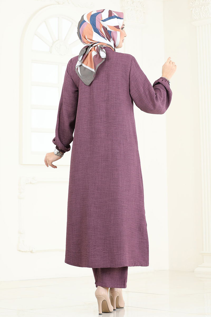 Product Feature : It is a new season hijab fashion product. The product has a Half Judge collar. The product has From the front buttons. The tunic has a side slash.. Unlined. Stone details are pebble. The waist of the trousers is elastic. The cuff is rubberized. There may be a tonal difference in the product due to concept photo shoots.