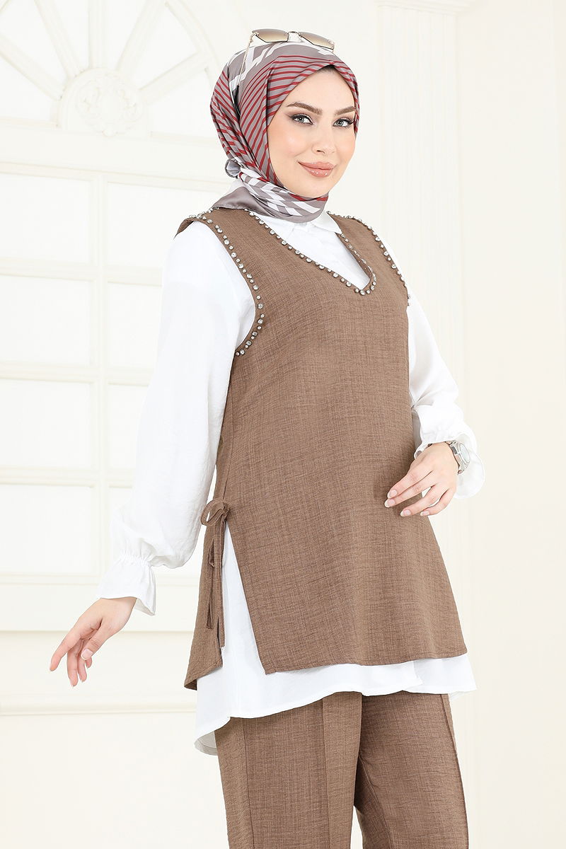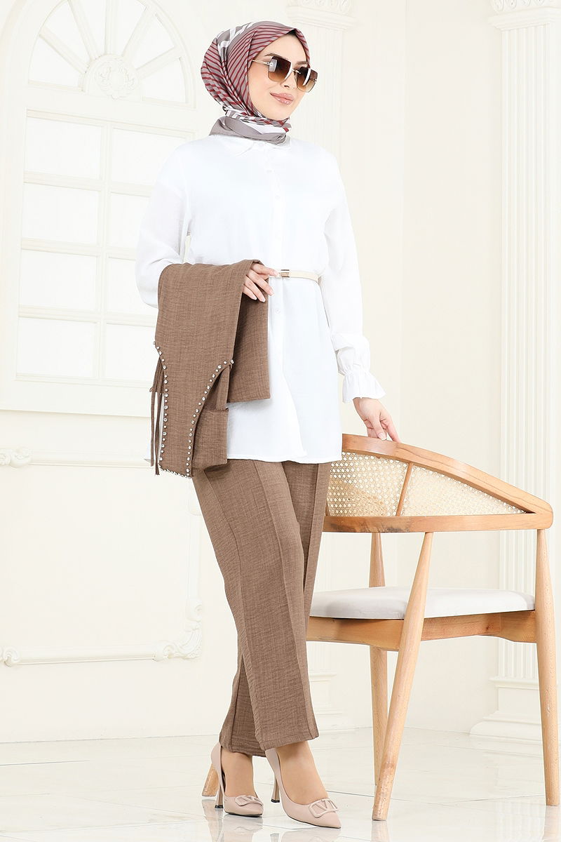 المنتج لديه ياقة القميص. المنتج به أزرار من الأمام. يحتوي على فتحة. غير مبطنة. تم اضافة اللؤلؤ بطريقة التعبئة التفاصيل الحجرية محفورة. المنتج بأربطة. خصر البنطال مرن. السوار مطاطي. قد يكون هناك اختلاف في الدرجة اللونية في المنتج بسبب التقاط الصور الفوتوغرافية.