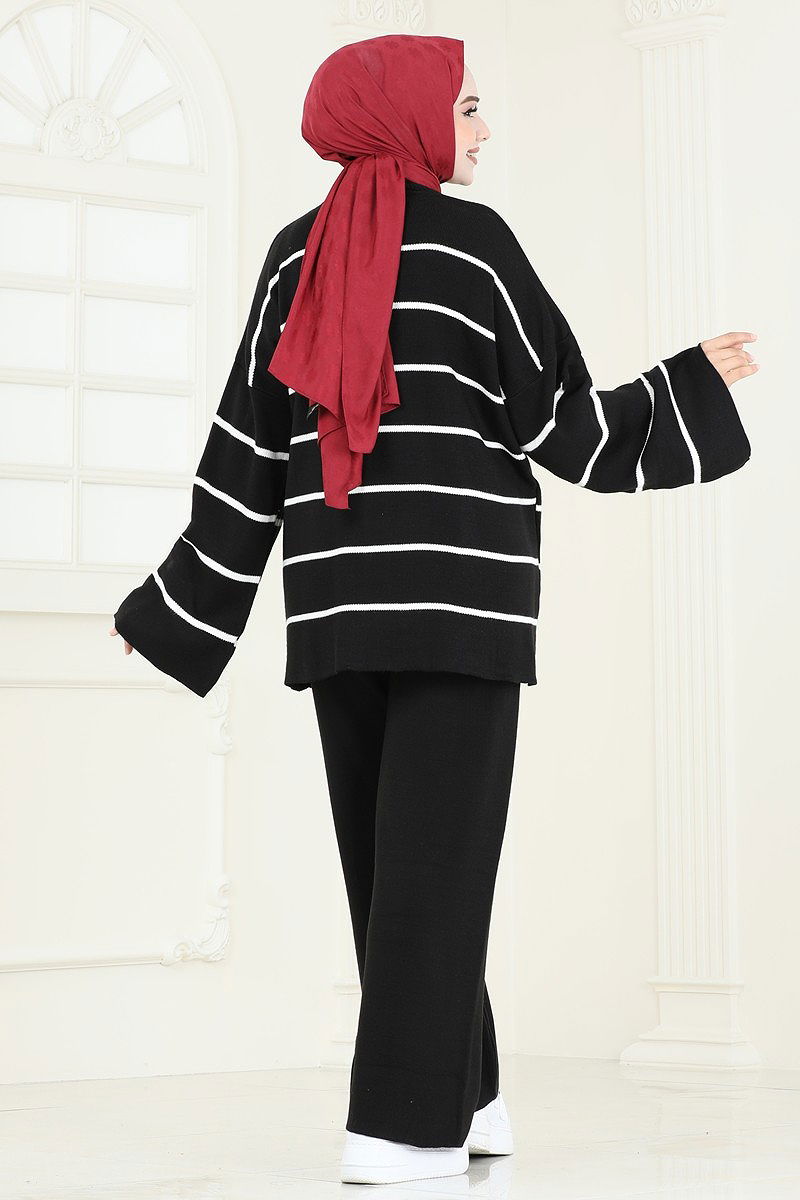 Striped Detail Knitwear Set model is a modest fashion product. It can be used in Autumn and Winter seasons. Should be washed at 30 degrees without spinning. Knitwear fabric. The product has a Mandarin collar and is lined. (The product on the model is standard size.) The inner dress is worn from the head. The pants have an elastic waistband.