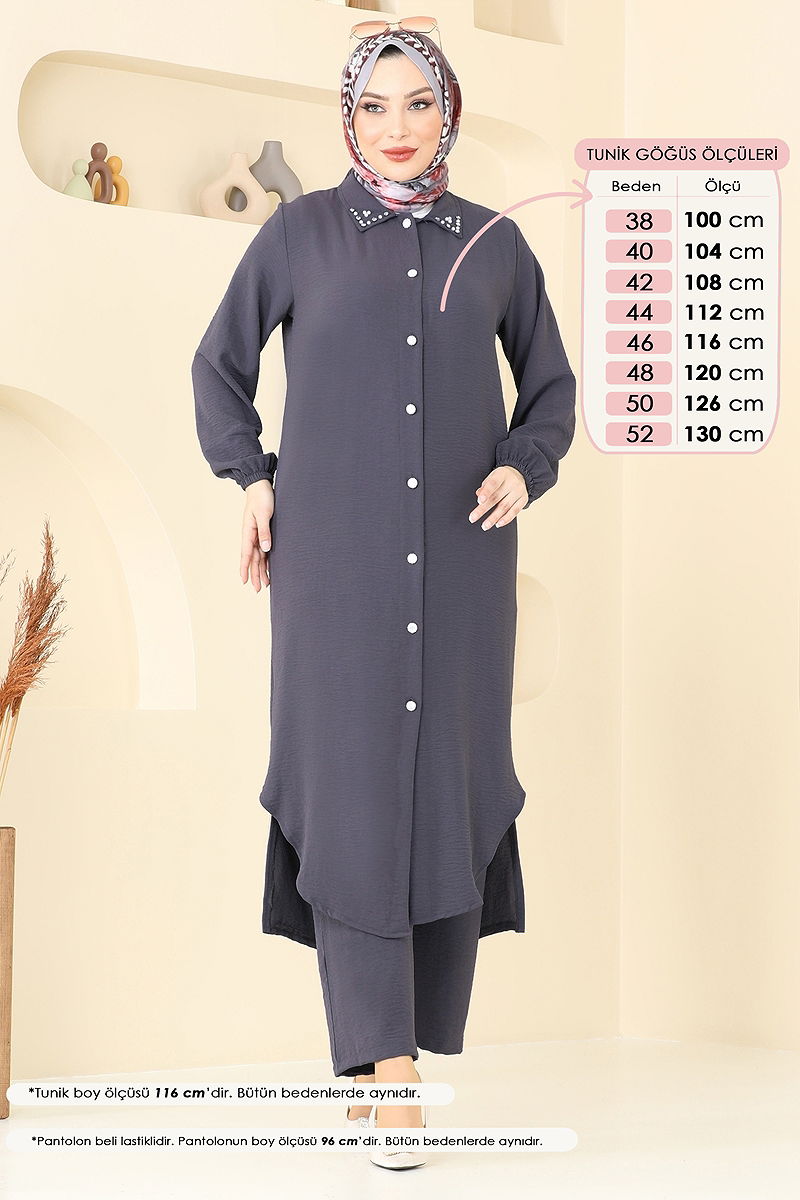 المنتج لديه ياقة القميص. المنتج به أزرار من الأمام. غير مبطنة. التفاصيل الحجرية محفورة. تم اضافة اللؤلؤ بطريقة التعبئة خصر البنطال مرن. السوار مطاطي. قد يكون هناك اختلاف في الدرجة اللونية في المنتج بسبب التقاط الصور الفوتوغرافية.