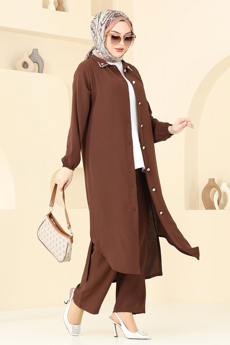 المنتج لديه ياقة القميص. المنتج به أزرار من الأمام. غير مبطنة. التفاصيل الحجرية محفورة. تم اضافة اللؤلؤ بطريقة التعبئة خصر البنطال مرن. السوار مطاطي. قد يكون هناك اختلاف في الدرجة اللونية في المنتج بسبب التقاط الصور الفوتوغرافية.