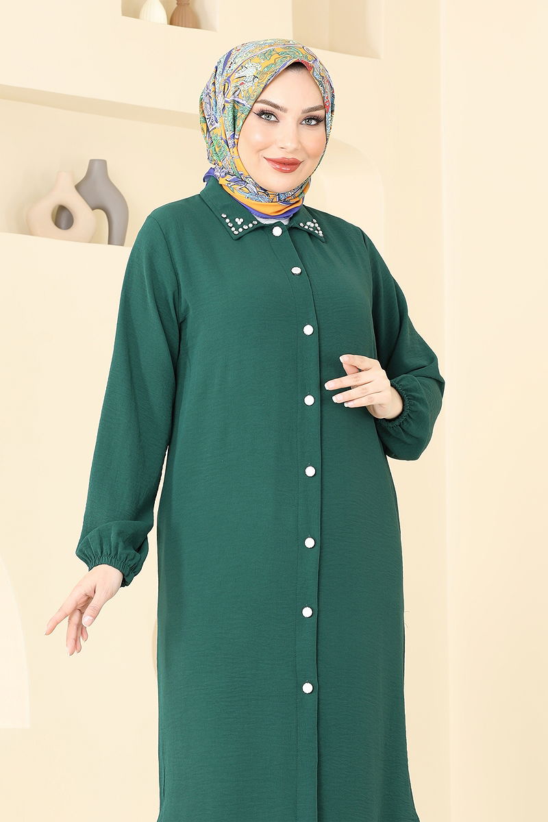 Product Feature : It is a new season hijab fashion product. The product has a Shirt collar. The product has From the front buttons. Unlined. Stone details are pebble. Pearl details are my pocket knife. The waist of the trousers is elastic. The cuff is rubberized. There may be a tonal difference in the product due to concept photo shoots.