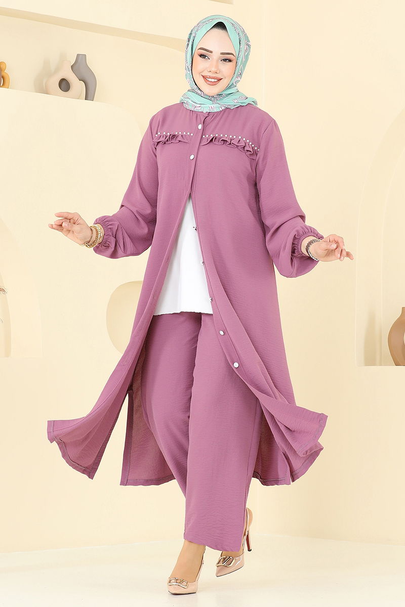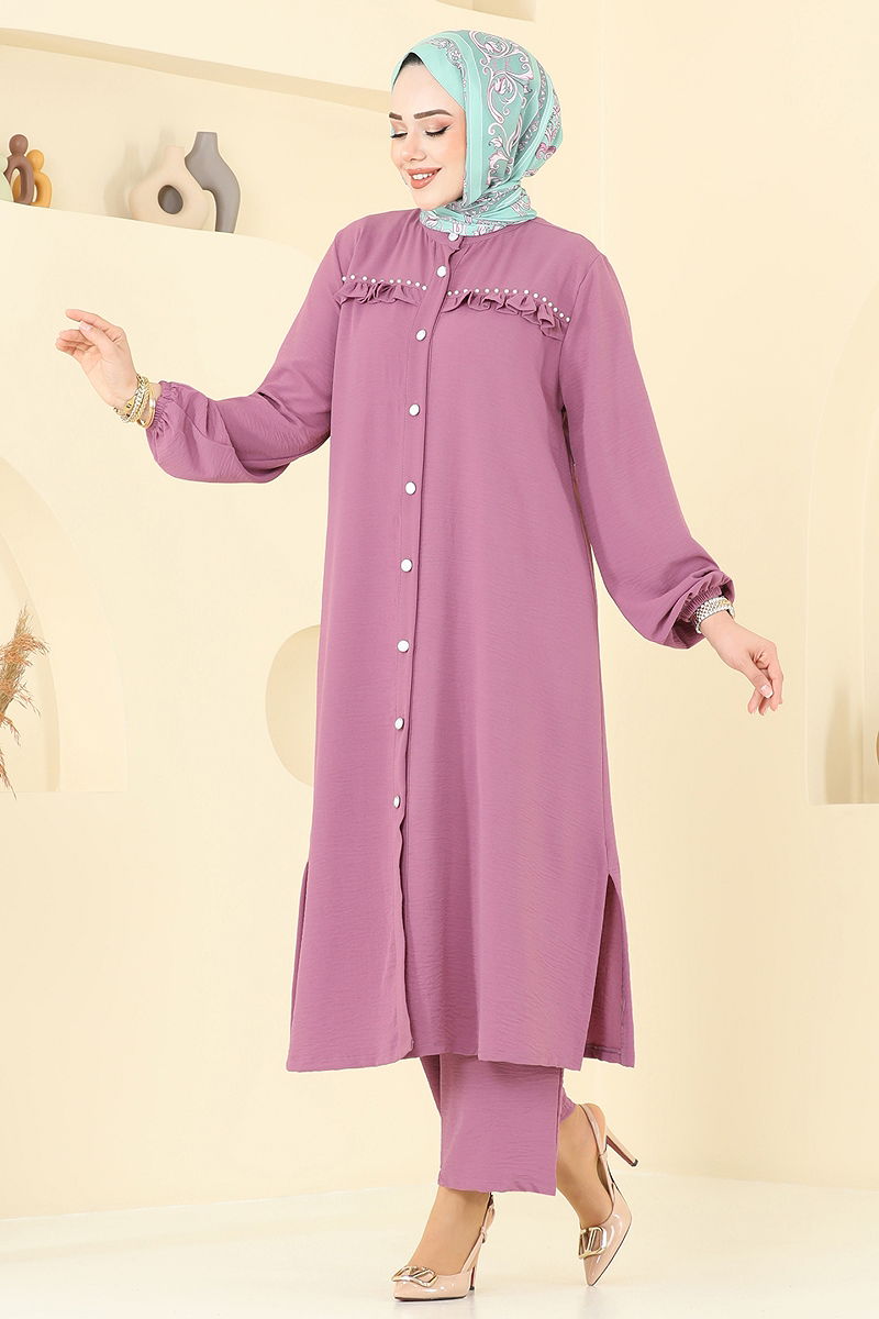 المنتج لديه ياقة نصف بيضوية. المنتج به أزرار من الأمام. البلوز تحتوي على فتحة. غير مبطنة. تم اضافة اللؤلؤ بطريقة التعبئة البلوزة غير متضمنة. صُنعت عينة من المجموعة مع البلوزة لإظهار الاستخدام المقصود للمنتج. خصر البنطال مرن. السوار مطاطي. قد يكون هناك اختلاف في الدرجة اللونية في المنتج بسبب التقاط الصور الفوتوغرافية.