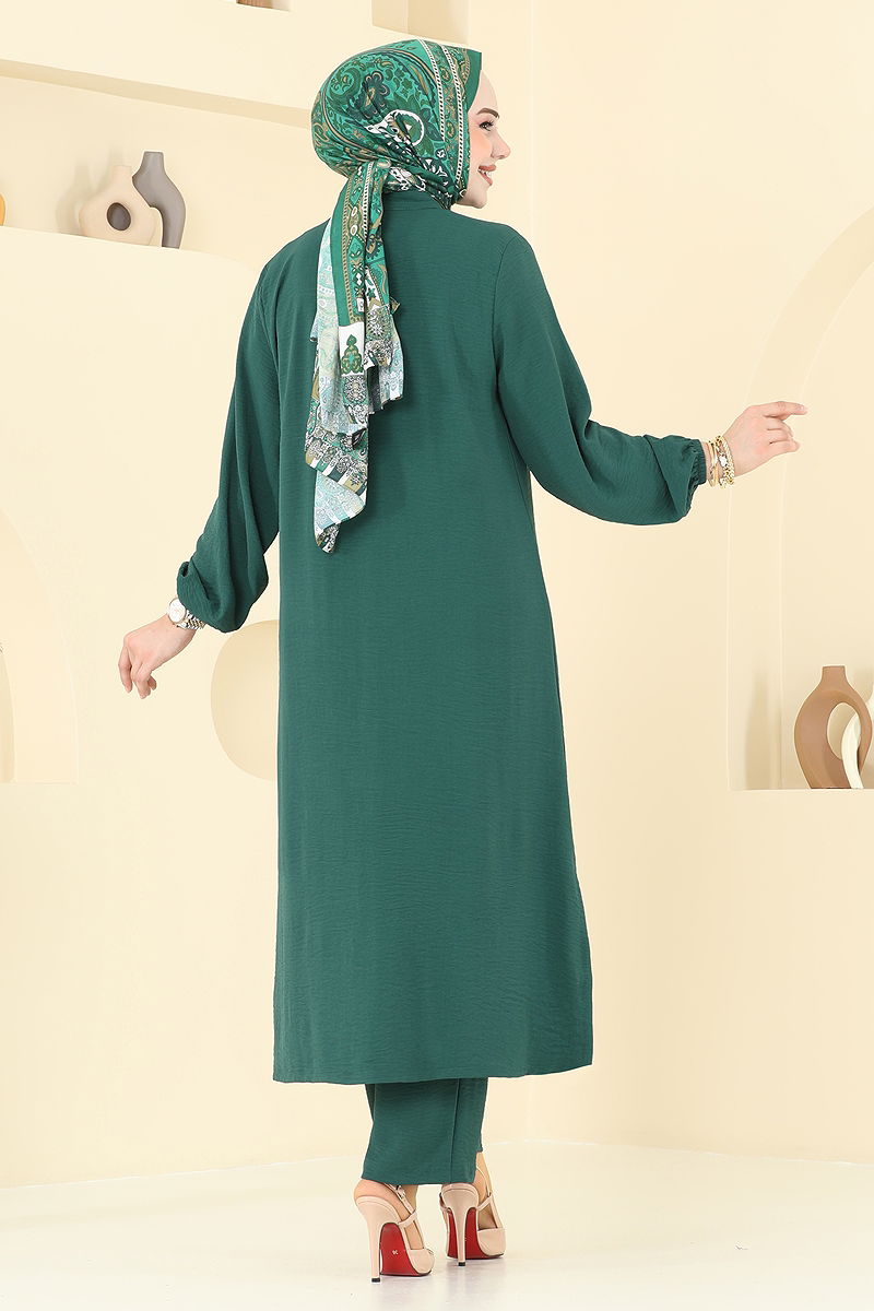 The Pearl Detail Set is a modern modest wear ensemble that offers both style and comfort. Suitable for all seasons, this set is easy to care for with its 30-degree delicate wash option. Made from Aerobin fabric, the product features a semi-mandarin collar and front button details for functionality. The tunic has side slits, while the trousers feature an elastic waist. Pearl embellishments add a touch of elegance with their embedded design. With elasticated cuffs, this set is perfect for those seeking comfort and style.