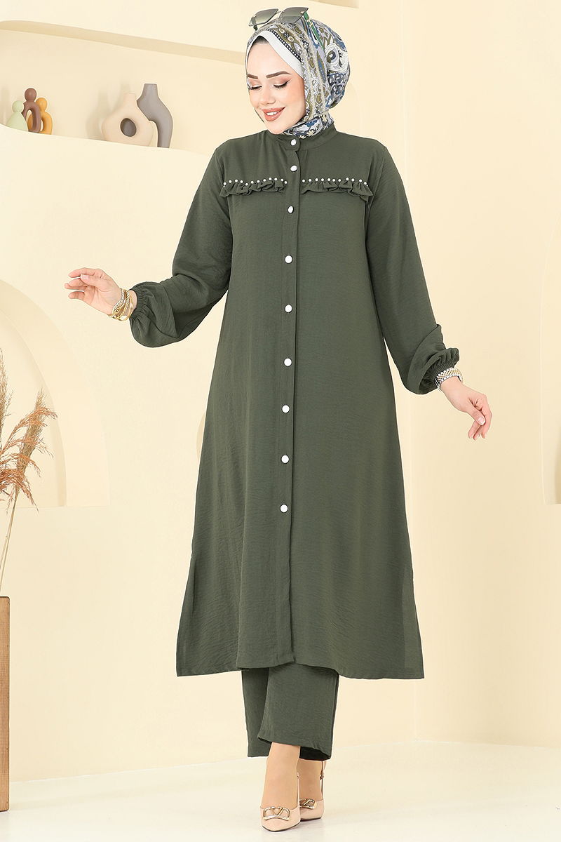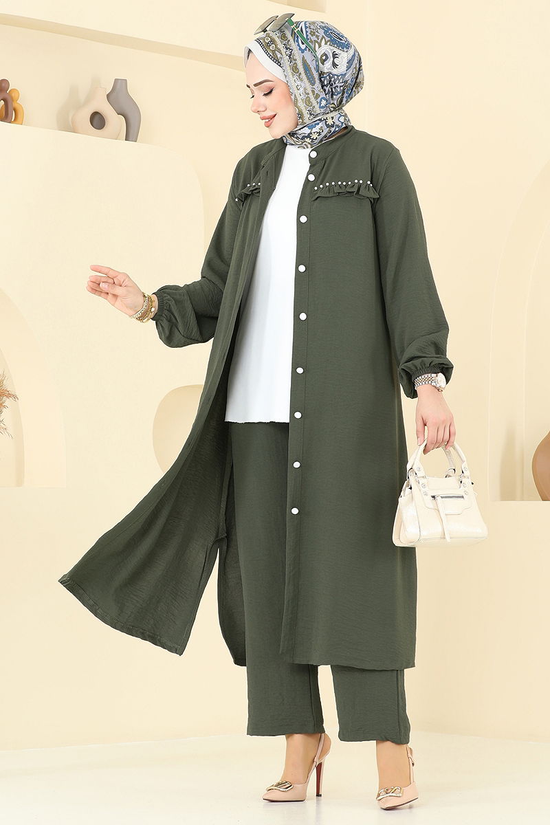المنتج لديه ياقة نصف بيضوية. المنتج به أزرار من الأمام. البلوز تحتوي على فتحة. غير مبطنة. تم اضافة اللؤلؤ بطريقة التعبئة البلوزة غير متضمنة. صُنعت عينة من المجموعة مع البلوزة لإظهار الاستخدام المقصود للمنتج. خصر البنطال مرن. السوار مطاطي. قد يكون هناك اختلاف في الدرجة اللونية في المنتج بسبب التقاط الصور الفوتوغرافية.