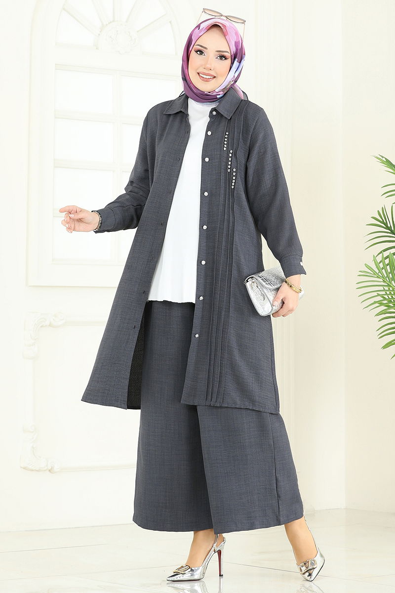 Elegantly designed and comfortable, the Stone Detail Linen Suit is versatile across all seasons. Made from Sofia linen fabric, this modest wear suit can be gently washed at 30°C. It features a shirt collar and front button details for a contemporary look, and is unlined for freedom of movement. The waist of the pants is elastic for ultimate comfort, while the stone details add a touch of elegance. This chic suit is completed with Tunik and PANTS, featuring active cuff buttons.