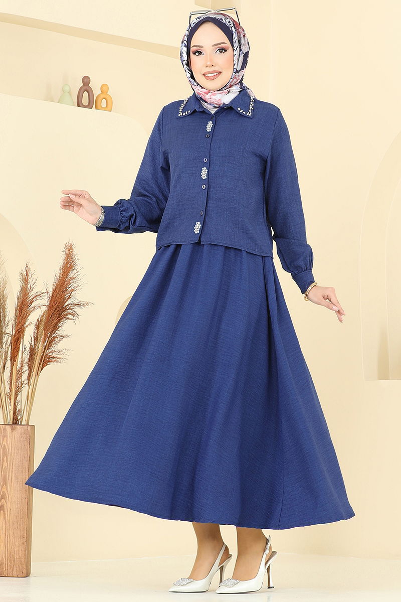 Product Feature : It is a new season hijab fashion product. The product has a Shirt collar. The product has From the front buttons. Unlined. Pearl details are my pocket knife. Stone details are pebble. Blouse is not included. Sample combination is made with the blouse to show the intended use of the product. The skirt waist is elastic. Cuff buttons are active. There may be a tonal difference in the product due to concept photo shoots.