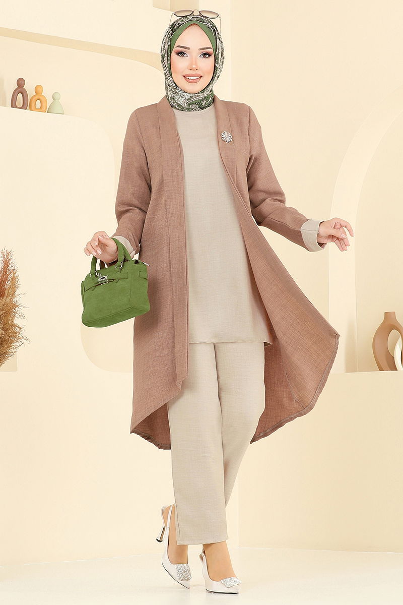 The Asymmetric Cut Three-Piece COMBINATION is an elegantly designed modest wear outfit made from sofia linen, suitable for all seasons. It features a liner-free crew neck, sleeveless inner tunic, and an elastic waist on the pants. Offering both style and comfort, this set can be washed at 30 degrees on a gentle cycle. The practical buttoned back makes it easy to wear, ensuring it becomes a favorite in your wardrobe with its perfect fit and chic design.
