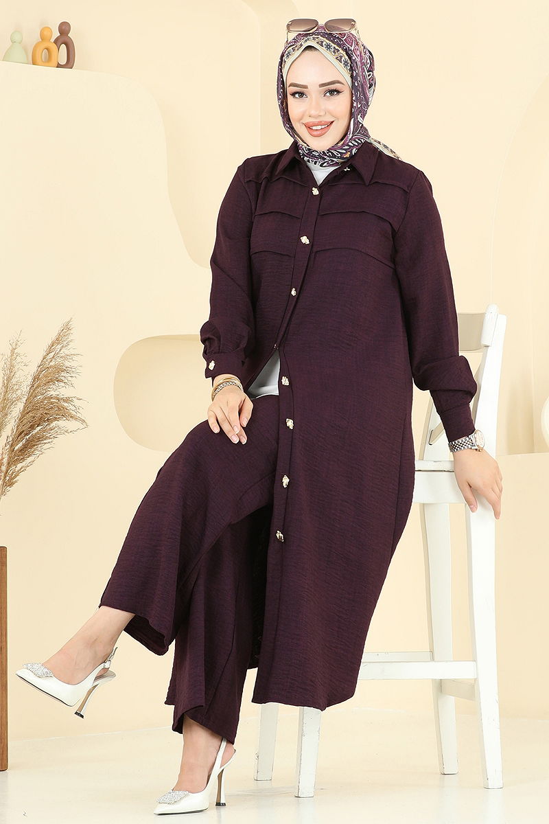 Product Feature : It is a new season hijab fashion product. The product has a Shirt collar. The product has From the front buttons. Unlined. The waist of the trousers is elastic. Cuff buttons are active. There may be a tonal difference in the product due to concept photo shoots.
