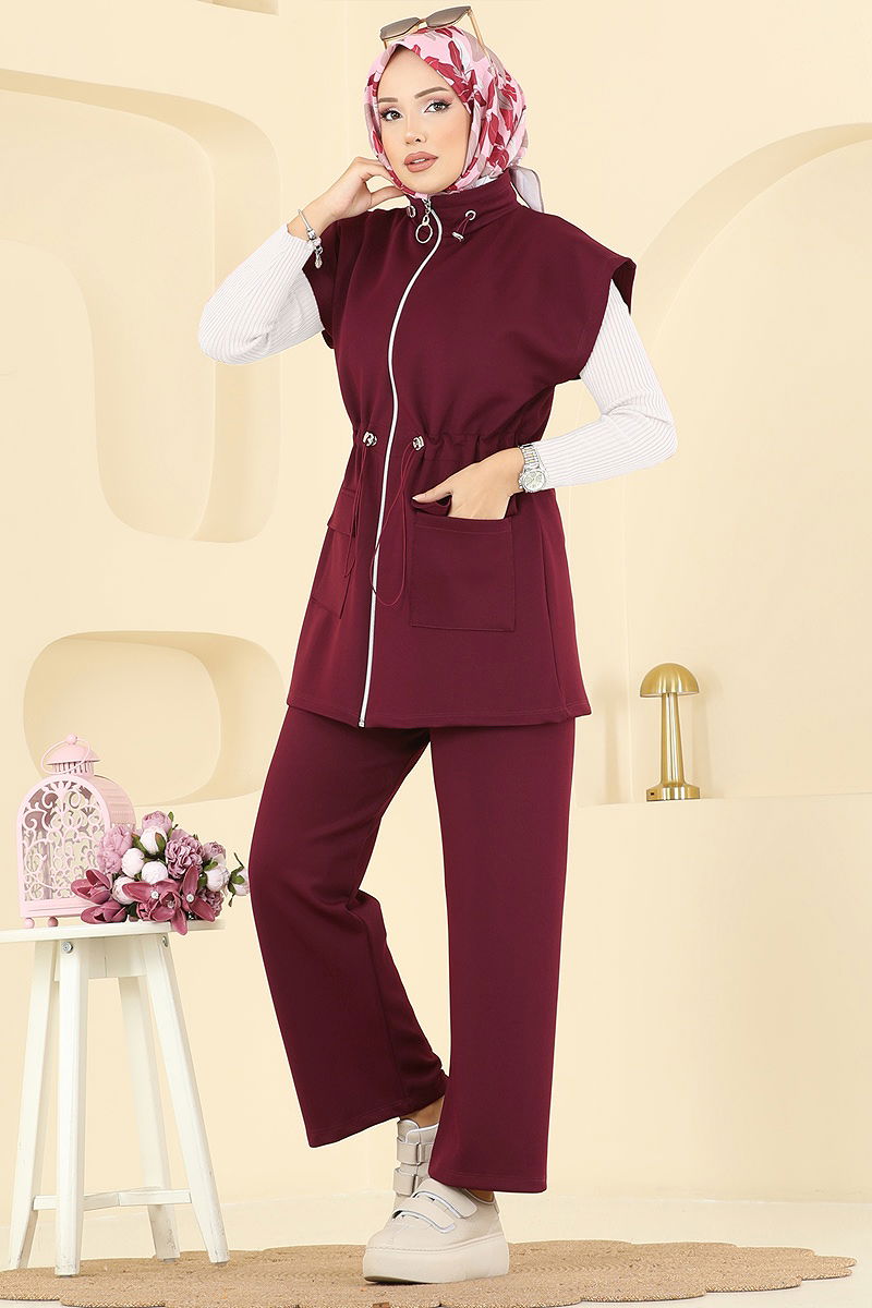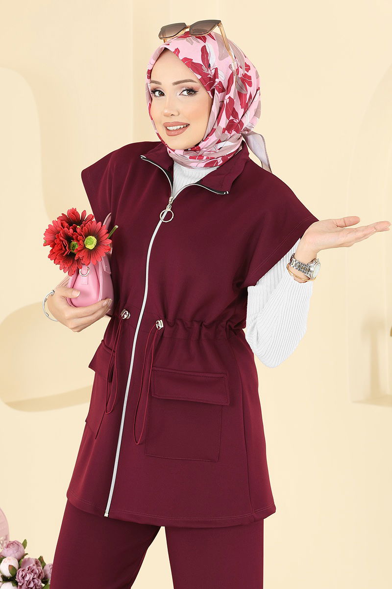 The Cap Sleeve Scuba Set is a stylish and comfortable modest clothing option. Suitable for all seasons, this set can be washed at 30 degrees with delicate settings. Made from scuba diver fabric, it features a semi-mandarin collar design that lends a modern look. The garment is unlined and offers practicality with its front zipper detail. With a drawstring waist and elasticized pants waist, this ensemble provides both comfort and elegance. Additionally, the pockets in the vest and pants add functionality.