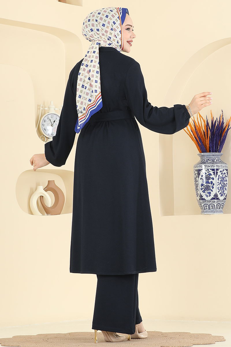 المنتج لديه ياقة نصف بيضوية. المنتج به أزرار من الأمام. غير مبطنة. الحزام متضمن، ،يمكن استخدامها حسب الرغبة خصر البنطال مرن. السوار مطاطي. قد يكون هناك اختلاف في الدرجة اللونية في المنتج بسبب التقاط الصور الفوتوغرافية.
