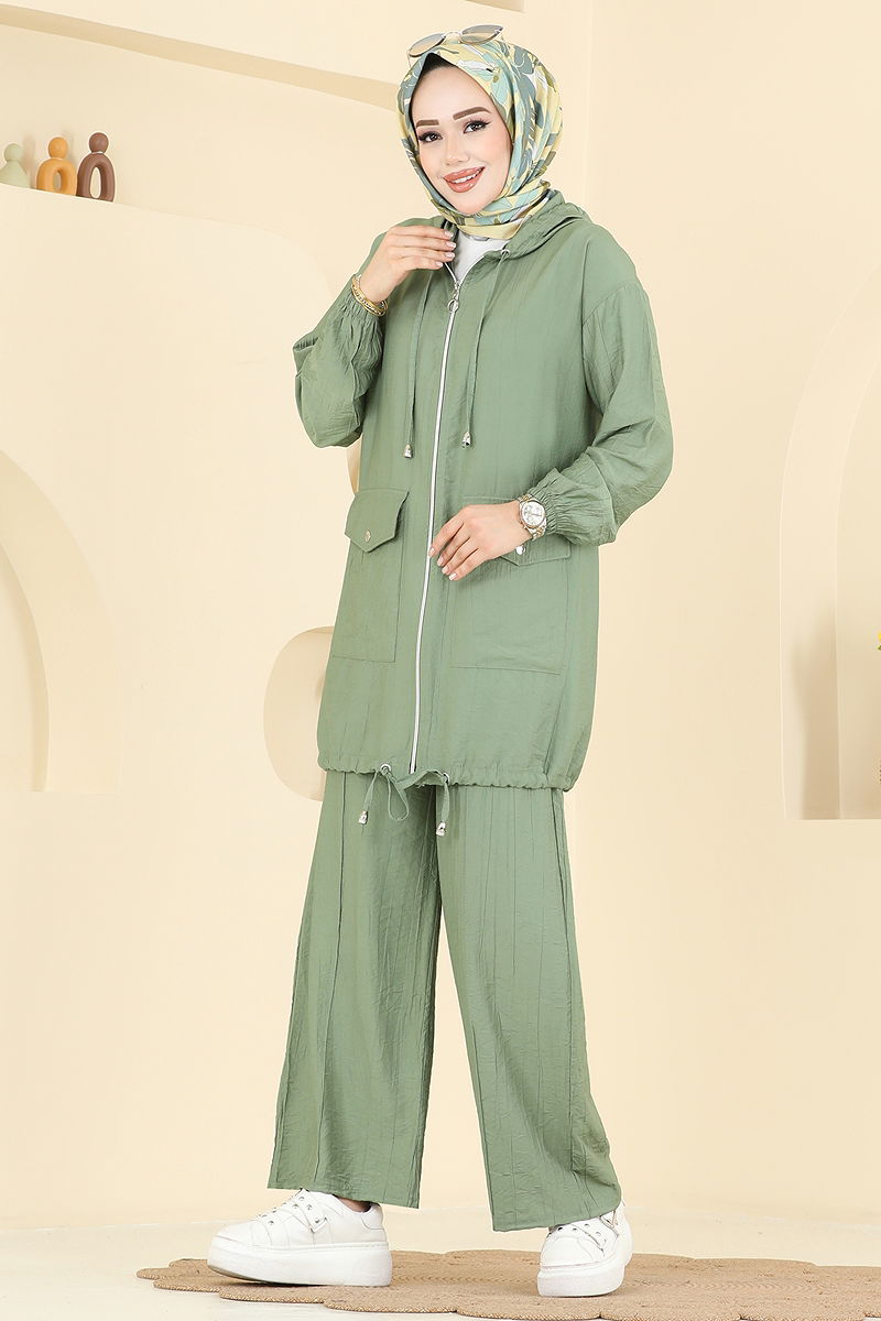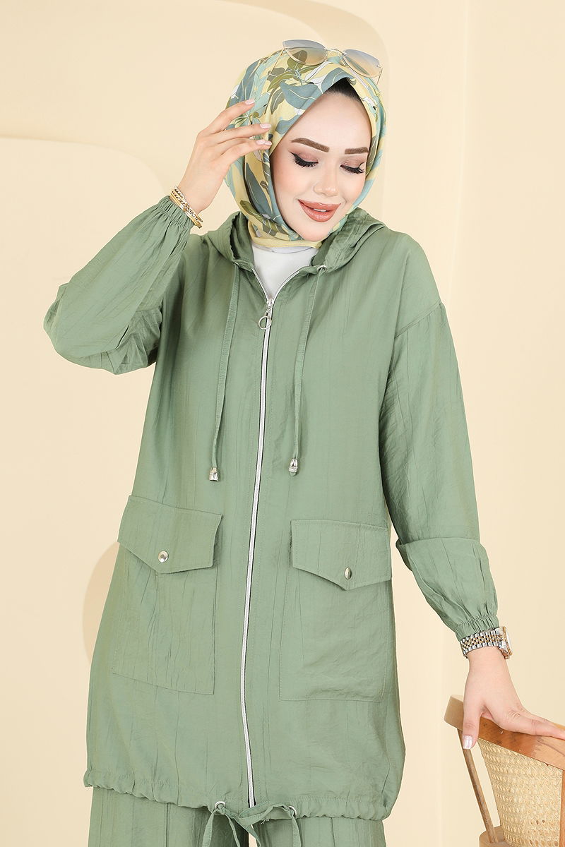 Product Feature : It is a new season hijab fashion product. The neck drawstring is active. The product has a Hooded collar. Unlined. The product has a zipper at the From the front part. There are adjustable laces on the right and left hem of the product. The hood is sewn to the product. Pocket available. The waist of the trousers is elastic. The cuff is rubberized. There may be a tonal difference in the product due to concept photo shoots.