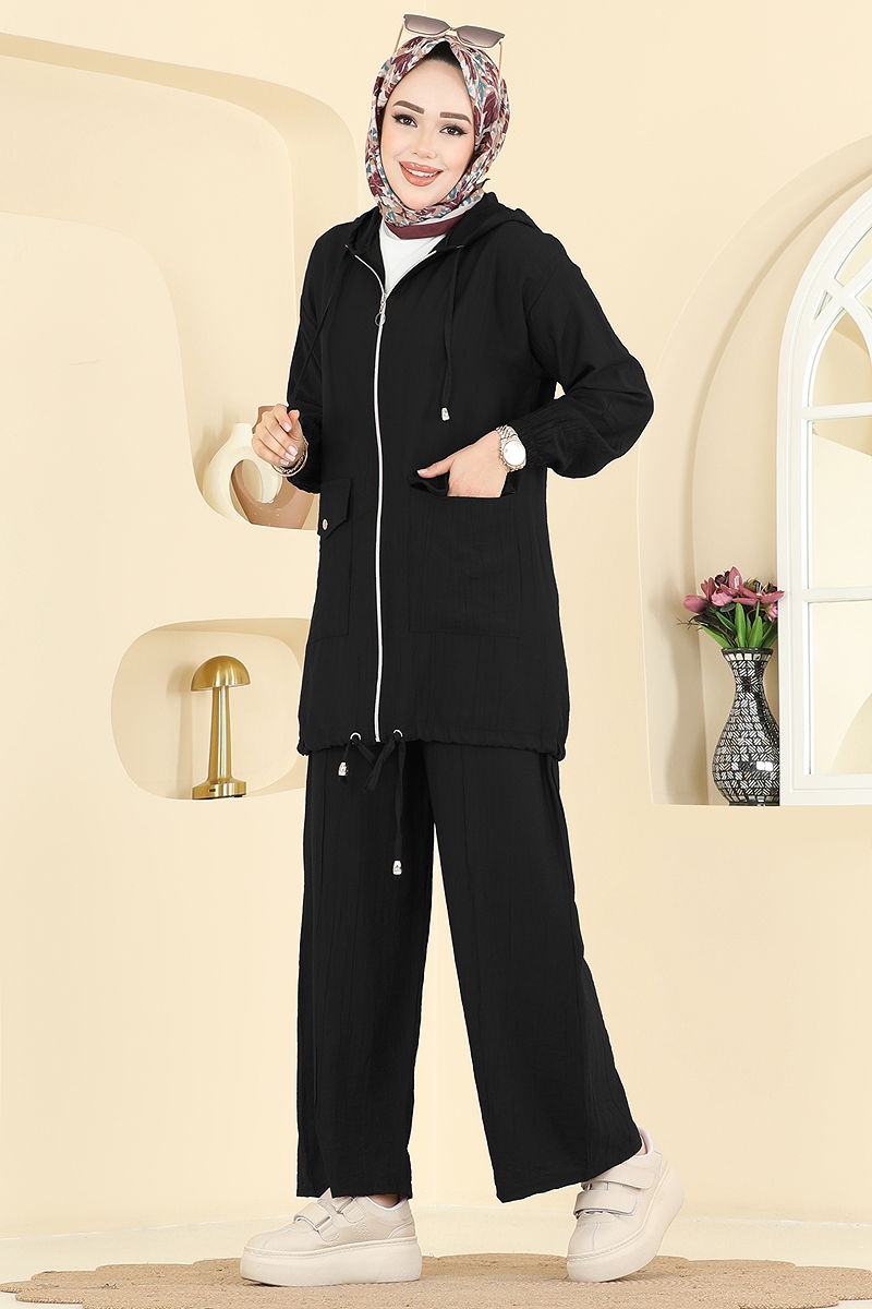 Product Feature : It is a new season hijab fashion product. The neck drawstring is active. The product has a Hooded collar. Unlined. The product has a zipper at the From the front part. There are adjustable laces on the right and left hem of the product. The hood is sewn to the product. Pocket available. The waist of the trousers is elastic. The cuff is rubberized. There may be a tonal difference in the product due to concept photo shoots.