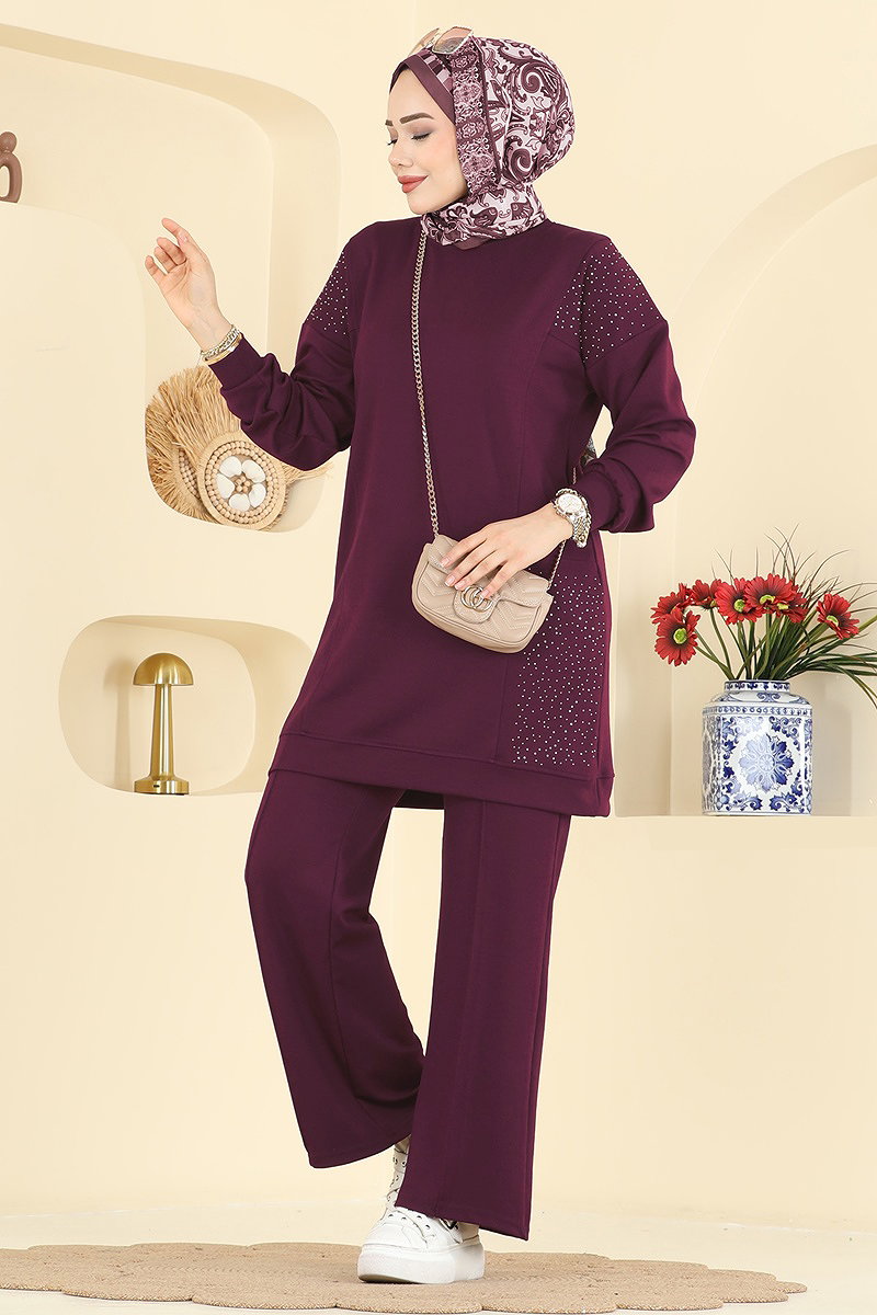 المنتج لديه ياقة دائرية. غير مبطنة. يتم لصق الحجارة. خصر البنطال مرن. قد يكون هناك اختلاف في الدرجة اللونية في المنتج بسبب التقاط الصور الفوتوغرافية.