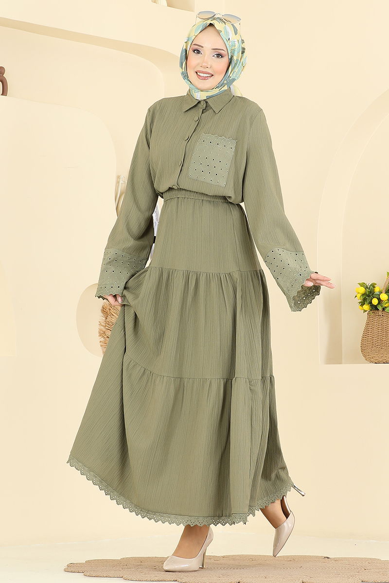 المنتج لديه ياقة القميص. المنتج به أزرار من الأمام. غير مبطنة. التفاصيل المخرمة مخيطة. الجيب الصدري نشط. .خصر التنورة مرن قد يكون هناك اختلاف في الدرجة اللونية في المنتج بسبب التقاط الصور الفوتوغرافية.