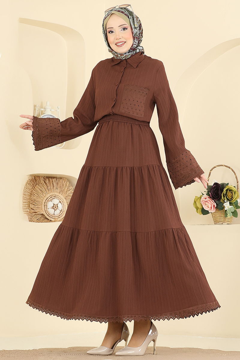 Product Feature : It is a new season hijab fashion product. The product has a Shirt collar. The product has From the front buttons. Unlined. The guipure detail is sewn. The chest pocket is active. The skirt waist is elastic. There may be a tonal difference in the product due to concept photo shoots.