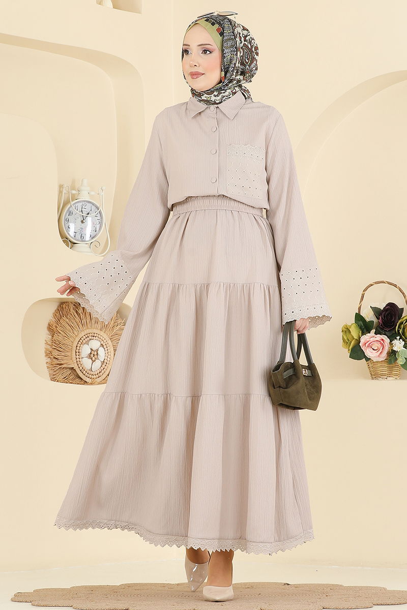 Product Feature : It is a new season hijab fashion product. The product has a Shirt collar. The product has From the front buttons. Unlined. The guipure detail is sewn. The chest pocket is active. The skirt waist is elastic. There may be a tonal difference in the product due to concept photo shoots.