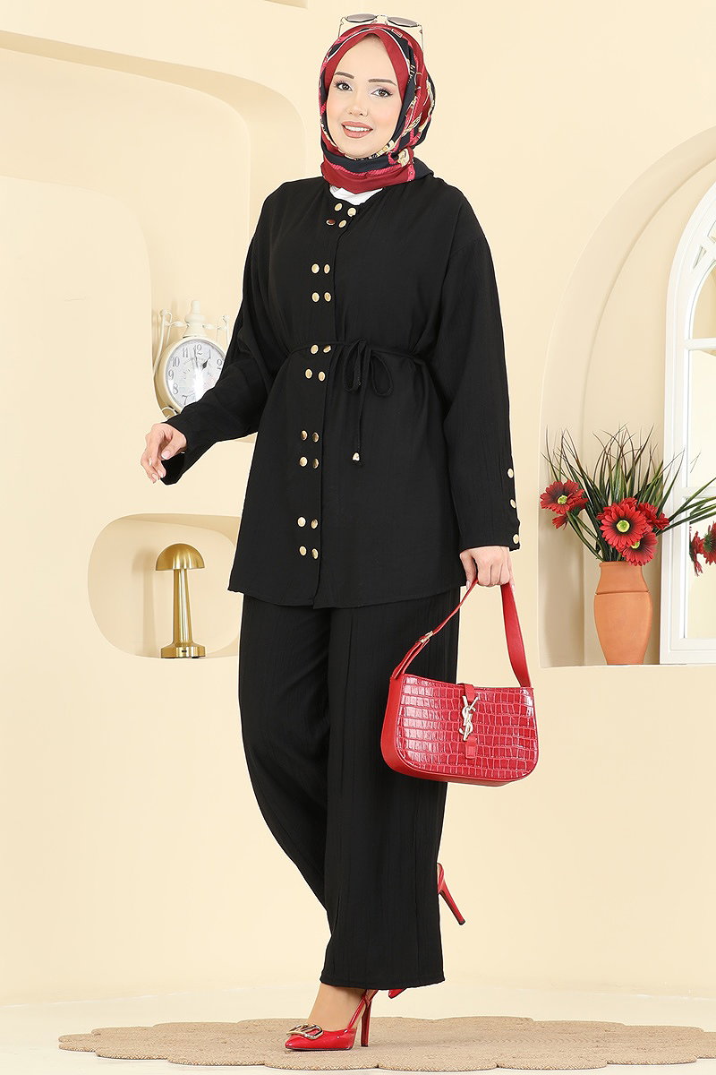 The Double Buttoned Aerobin Set is a chic and modern modest wear ensemble. Suitable for all seasons, this outfit can be gently washed at 30 degrees. Its soft woven fabric provides comfort all day long. Featuring a bicycle neck and an active buttoned front design, it offers practical use. Its unlined nature enhances lightness, while the elastic waistband on the pants ensures a perfect fit. Don't miss out on this combination that will maintain your elegance in every setting!