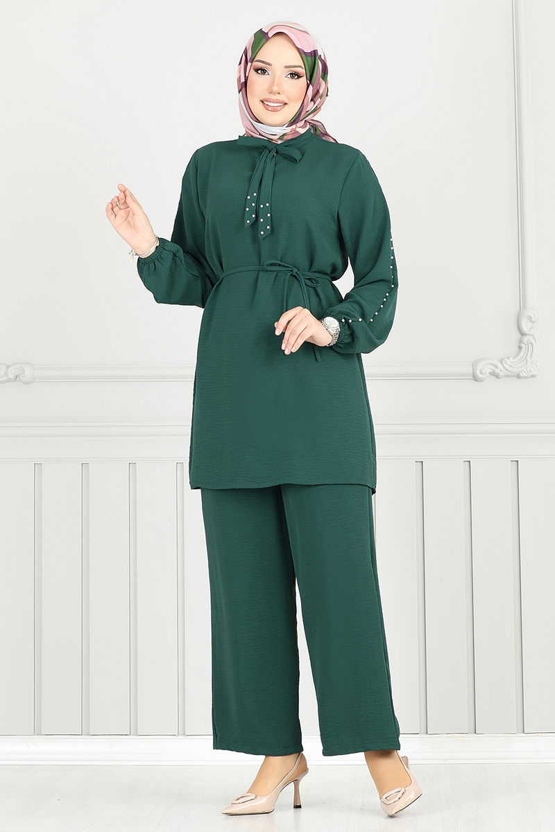 يتم ارتداء المنتج على الرأس. المنتج لديه ياقة الوشاح. غير مبطنة. تم اضافة اللؤلؤ بطريقة التعبئة الحزام متضمن، ،يمكن استخدامها حسب الرغبة خصر البنطال مرن. السوار مطاطي. قد يكون هناك اختلاف في الدرجة اللونية في المنتج بسبب التقاط الصور الفوتوغرافية.