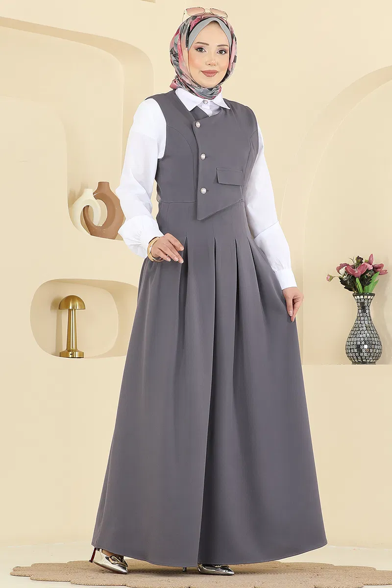 The Pearl Buttoned Vest Suit, crafted from Dabıl fabric, is an elegantly styled modest wear ideal for special occasions. Featuring a shirt collar and half-button front design for practicality, it is unlined for comfort with active buttons on the cuffs. This suit, adorned with a vest and shirt details, further captivates with its pocket accessory. Suitable for use across all seasons.
