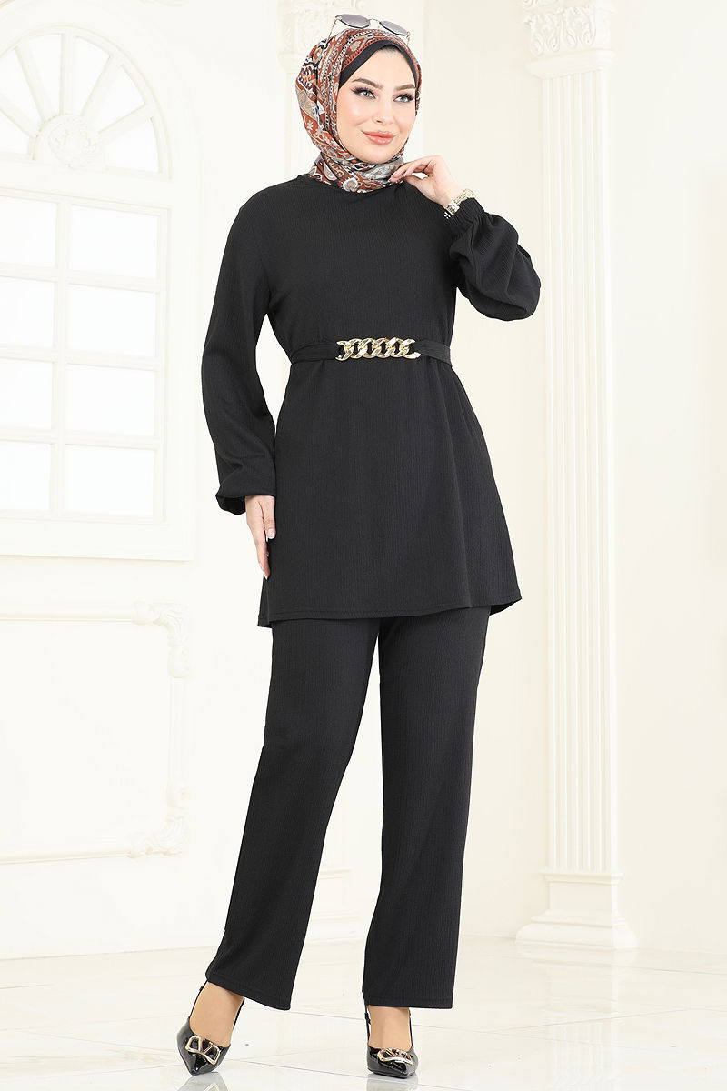 The Chain Belted Modest Suit is a stylish combination that can be comfortably worn in all seasons. This product, which can be washed at 30 degrees with a delicate wash setting, is made from crinkled fabric and features a bicycle neckline. The unlined suit adds a modern touch to modest clothing. The suit comes with pants that have an elastic waist and wristbands. The belt can be optionally used, though the chain is attached to the product. The model is 167 cm tall, with a chest of 90 cm, waist of 70 cm, hips of 100 cm, and weighs 59 kg.