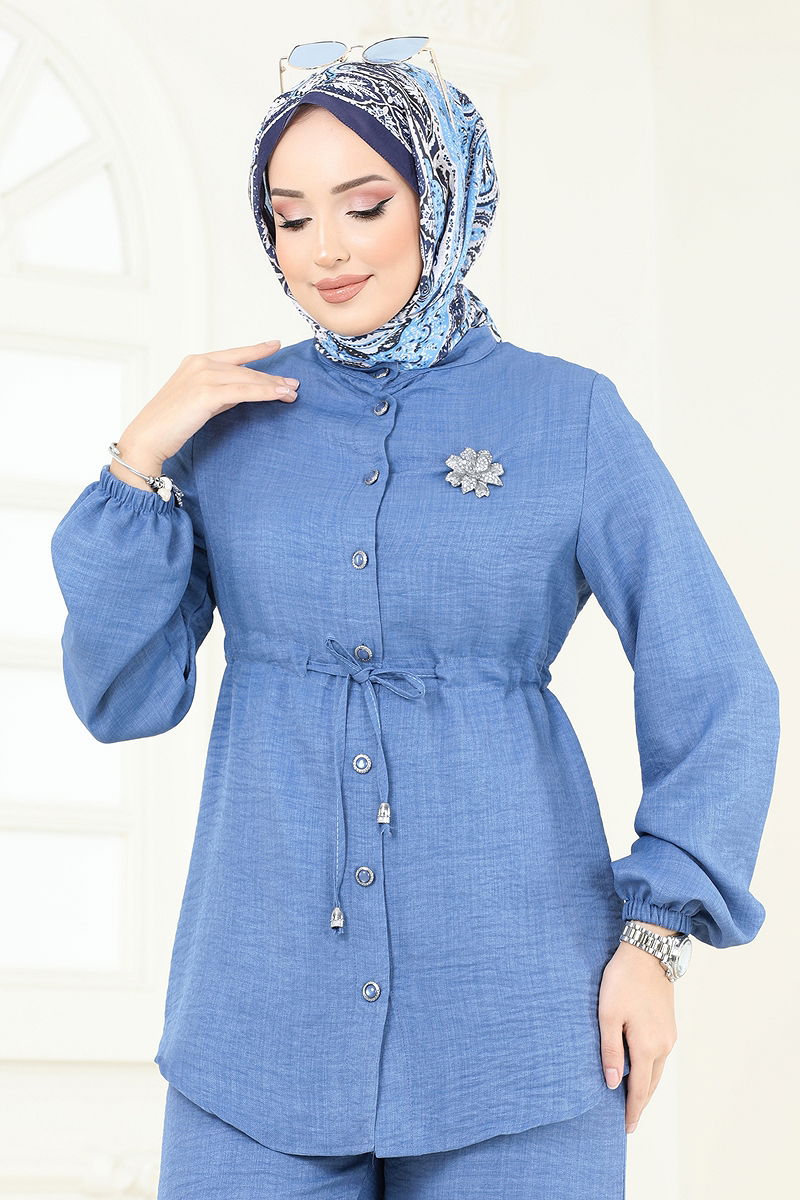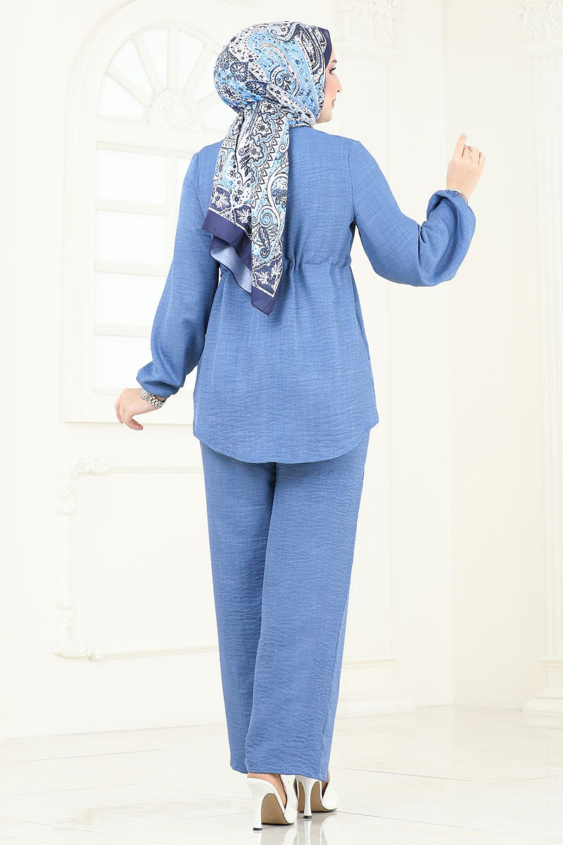 يتميز بخصر ذو أربطة. المنتج لديه ياقة نصف بيضوية. المنتج به أزرار من الأمام. غير مبطنة. الملحقات غير متضمنة. البلوزة غير متضمنة. صُنعت عينة من المجموعة مع البلوزة لإظهار الاستخدام المقصود للمنتج. خصر البنطال مرن. السوار مطاطي. قد يكون هناك اختلاف في الدرجة اللونية في المنتج بسبب التقاط الصور الفوتوغرافية.