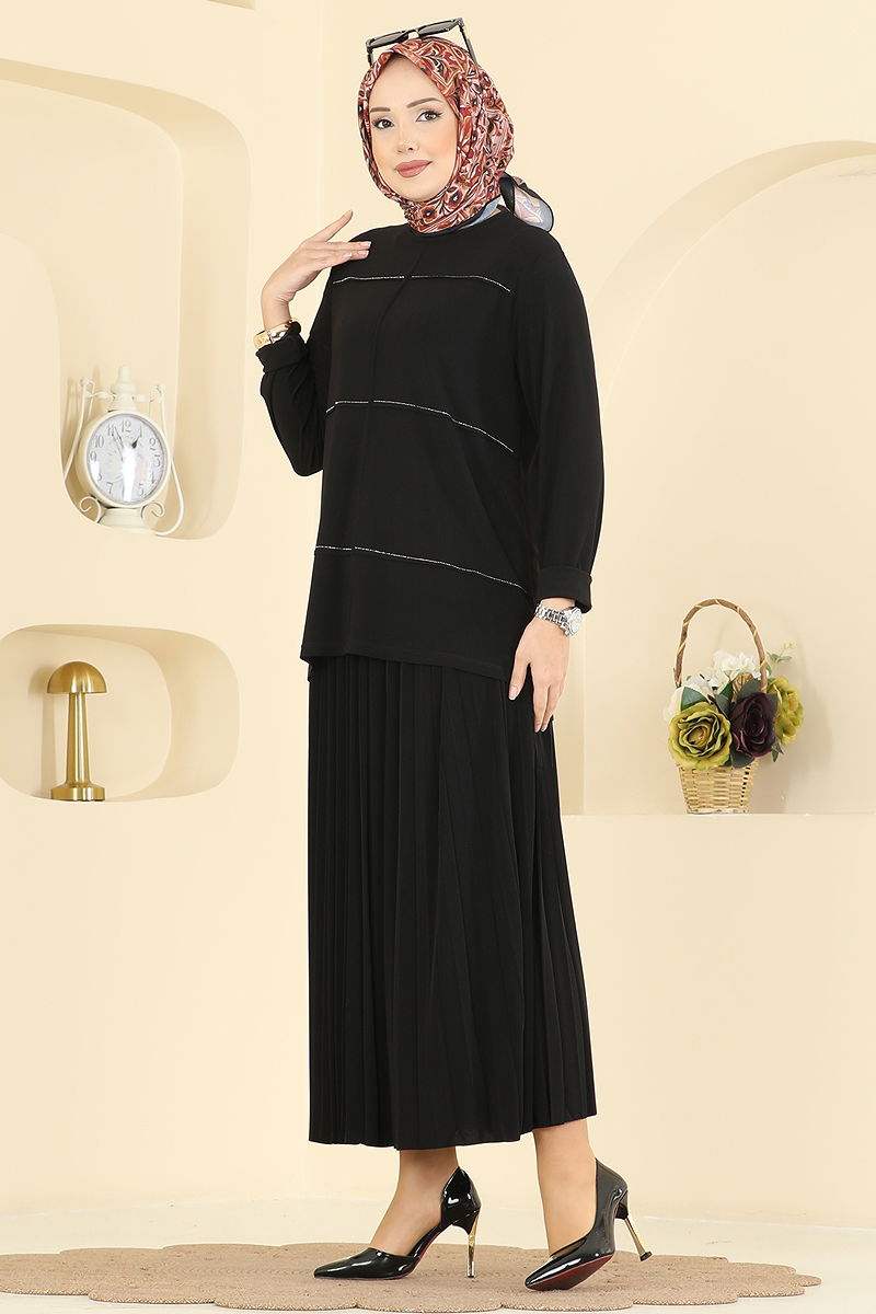 The Sandy Pleated Skirt Set is an elegantly designed modern modest wear outfit suitable for all seasons. This product can be gently washed at 30 degrees and features a biker neckline and a side-slit tunic for a blend of comfort and style. Its lining-free and non-transparent fabric offers extra comfort throughout the day. The elastic waistband on the skirt ensures comfort all day long, while the stone detailing adds a captivating look. The model worn in the images is a size 38, but it is available in various sizes.