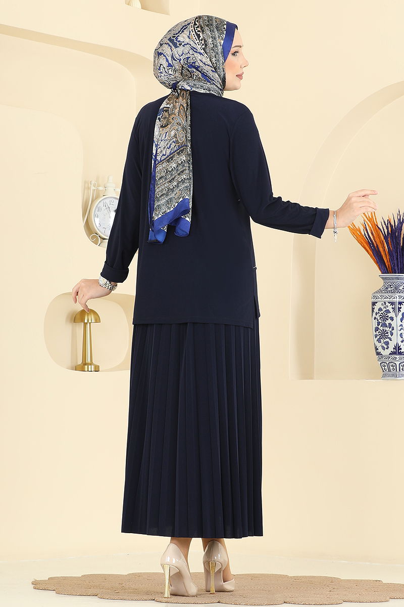 The Sandy Pleated Skirt Set is an elegantly designed modern modest wear outfit suitable for all seasons. This product can be gently washed at 30 degrees and features a biker neckline and a side-slit tunic for a blend of comfort and style. Its lining-free and non-transparent fabric offers extra comfort throughout the day. The elastic waistband on the skirt ensures comfort all day long, while the stone detailing adds a captivating look. The model worn in the images is a size 38, but it is available in various sizes.