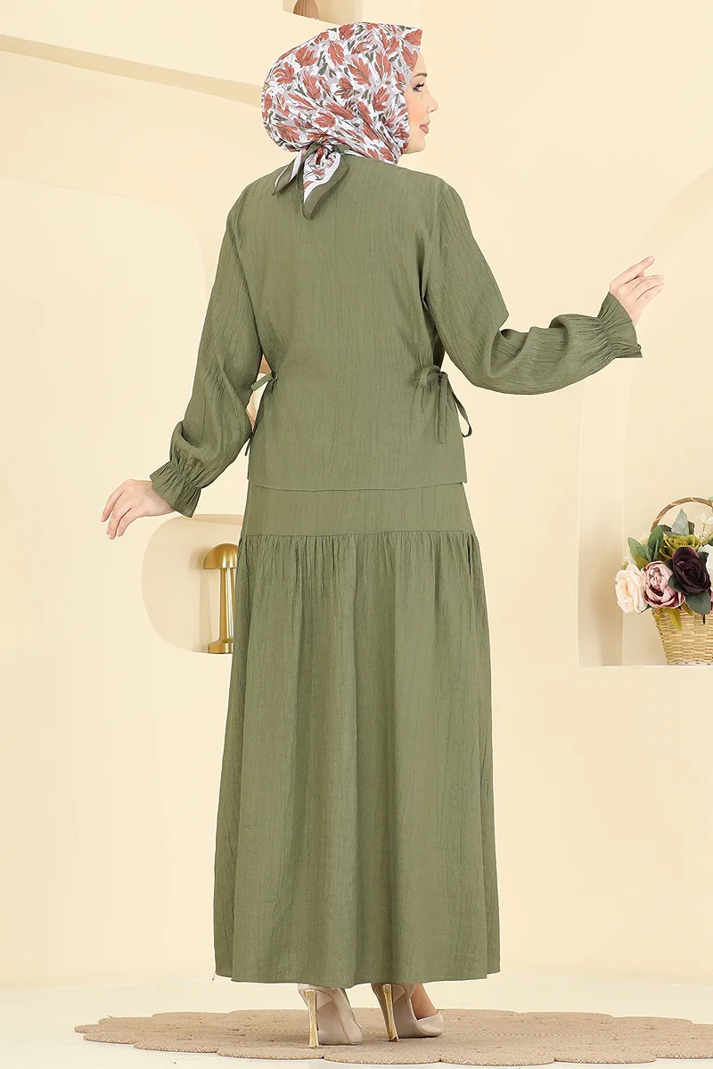Elegant and comfortable, the Woven Fabric 2-Piece Set is a unique modest wear piece that can be utilized throughout all seasons. This set, which can be washed delicately at 30 degrees, is manufactured from high-quality woven fabric. Its bicycle neck and front-button design add a modern and practical touch. Adjustable drawstrings on the sides and an elastic waistband on the skirt ensure a comfortable fit. Elastic cuffs on both the blouse and skirt complete the elegance of the ensemble. Available in a range of sizes, including a sample size 38 model for an ideal fit. Maintain your elegance in every setting, from everyday wear to special occasions.