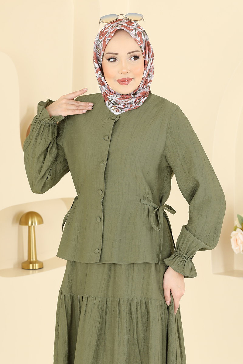 المنتج يحتوي على أربطة جانبية قابلة للاستخدام. المنتج لديه ياقة دائرية. المنتج به أزرار من الأمام. .خصر التنورة مرن السوار مطاطي. قد يكون هناك اختلاف في الدرجة اللونية في المنتج بسبب التقاط الصور الفوتوغرافية.