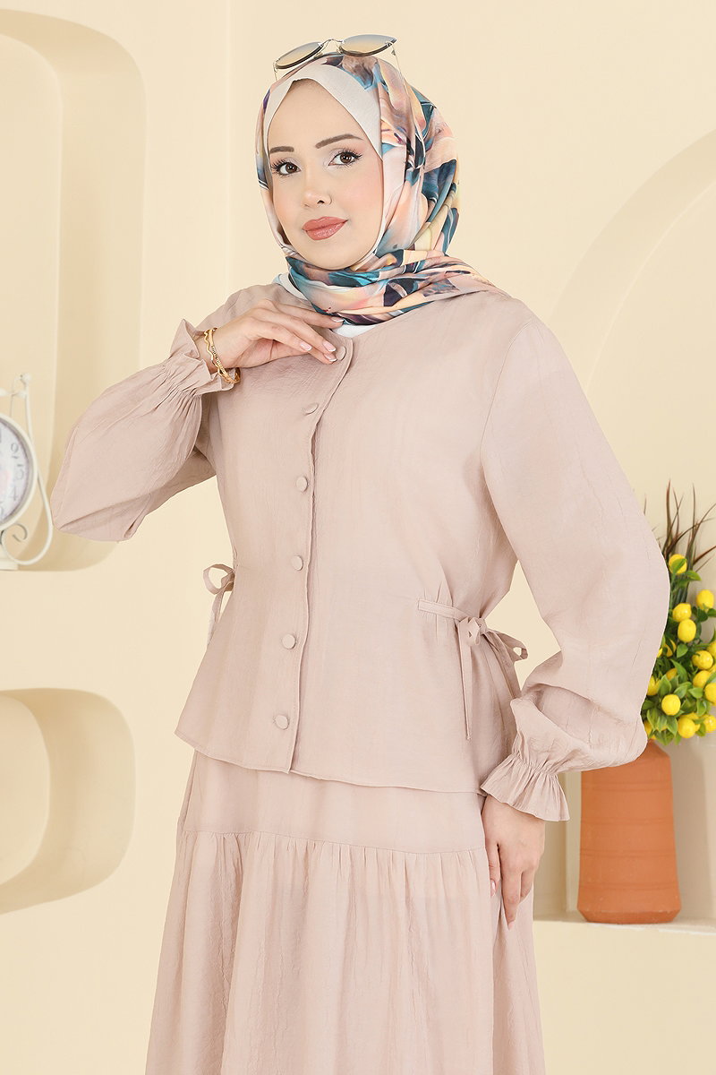 Elegant and comfortable, the Woven Fabric 2-Piece Set is a unique modest wear piece that can be utilized throughout all seasons. This set, which can be washed delicately at 30 degrees, is manufactured from high-quality woven fabric. Its bicycle neck and front-button design add a modern and practical touch. Adjustable drawstrings on the sides and an elastic waistband on the skirt ensure a comfortable fit. Elastic cuffs on both the blouse and skirt complete the elegance of the ensemble. Available in a range of sizes, including a sample size 38 model for an ideal fit. Maintain your elegance in every setting, from everyday wear to special occasions.