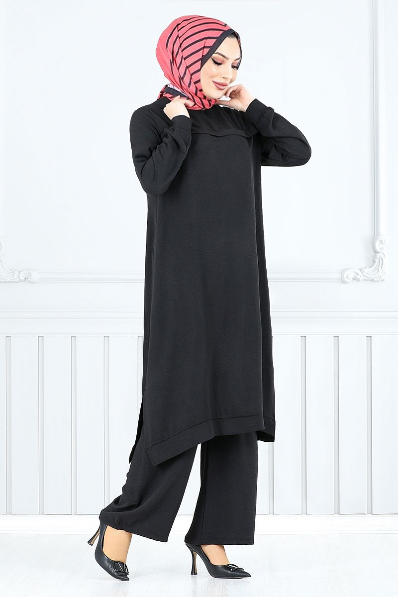 The Side-Slit Dual Set, specially designed as a modest wear piece, can be comfortably worn in all seasons. Thanks to its delicate fabric, it can be washed at 30 degrees without spinning and offers the comfort of aerobin fabric. Capture the perfect fit with a bike-neck, lining-free tunic, and elastic-waisted pants. The product shown on the model is size 40.