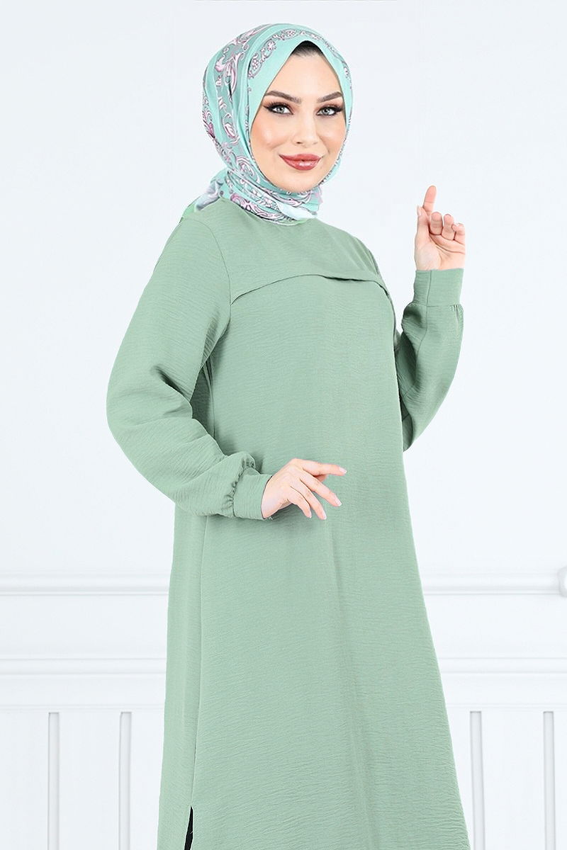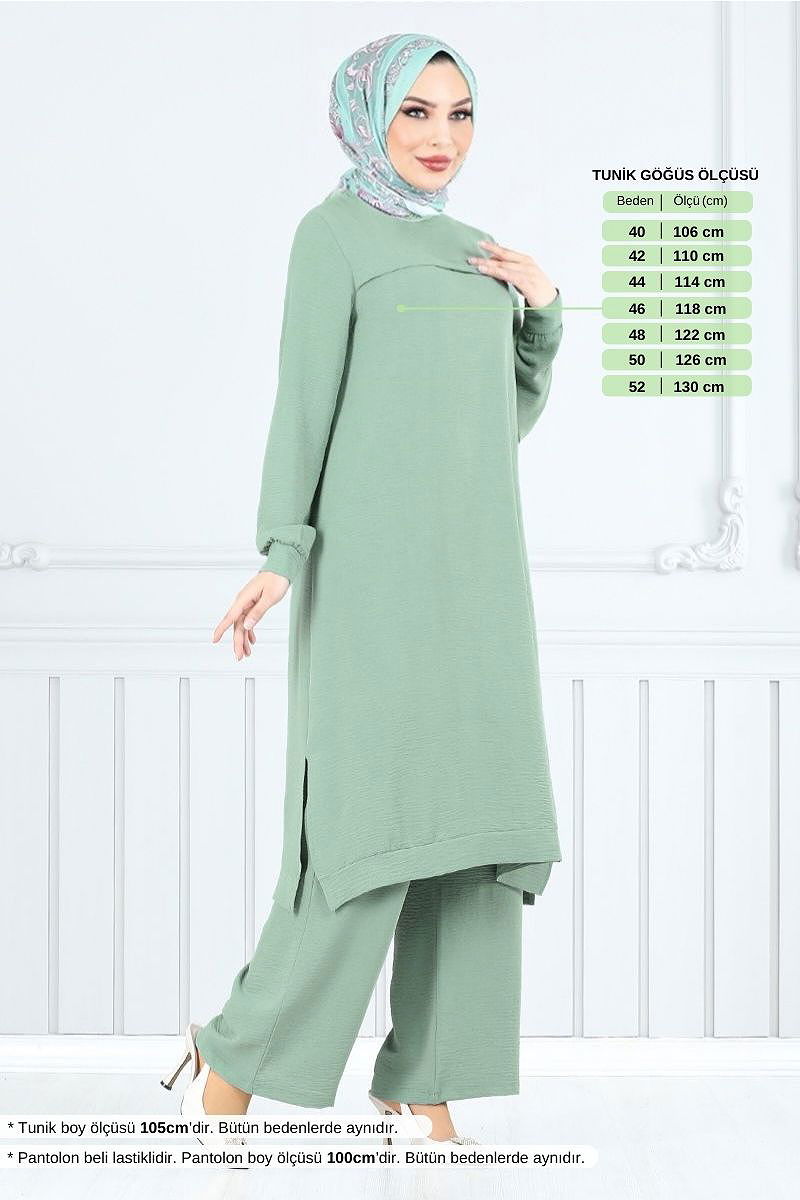 The Side-Slit Dual Set, specially designed as a modest wear piece, can be comfortably worn in all seasons. Thanks to its delicate fabric, it can be washed at 30 degrees without spinning and offers the comfort of aerobin fabric. Capture the perfect fit with a bike-neck, lining-free tunic, and elastic-waisted pants. The product shown on the model is size 40.