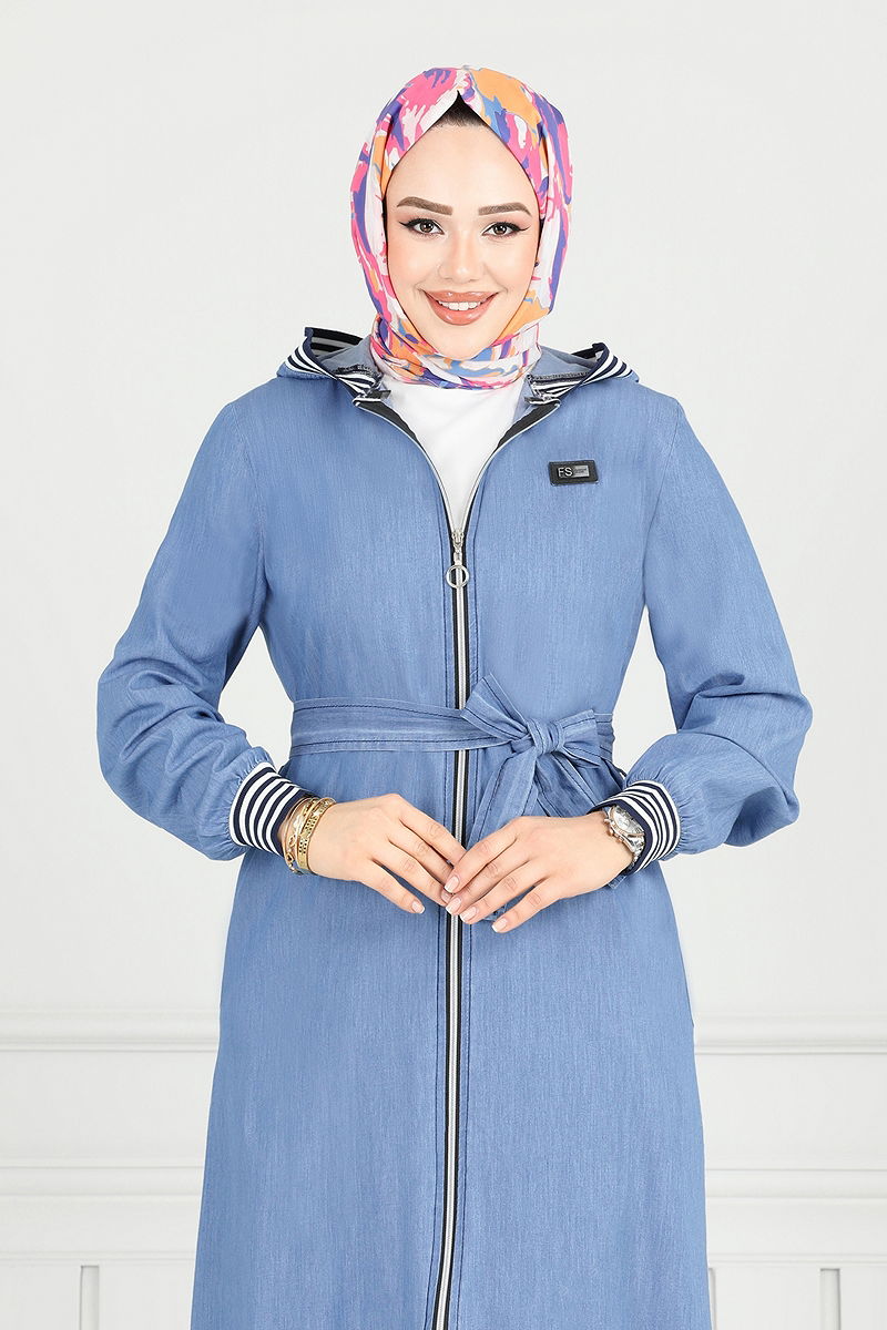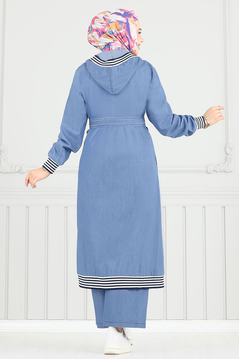 Achieve a stylish and comfortable look with the Arma Detail Denim Suit model. This hijab-friendly outfit can be conveniently worn in all seasons and offers gentle wash at 30 degrees Celsius. Made from denim, this hooded suit is lightweight and practical with its unlined design. It features a zippered front, sewn-on arma details for visual appeal, and sewn belt ends to prevent wavering. The pants have an elastic waist and ample pockets for functionality, while the belt is designed for optional use. Combining elegance and comfort, the Arma Detail Denim Suit will become an indispensable part of your wardrobe.