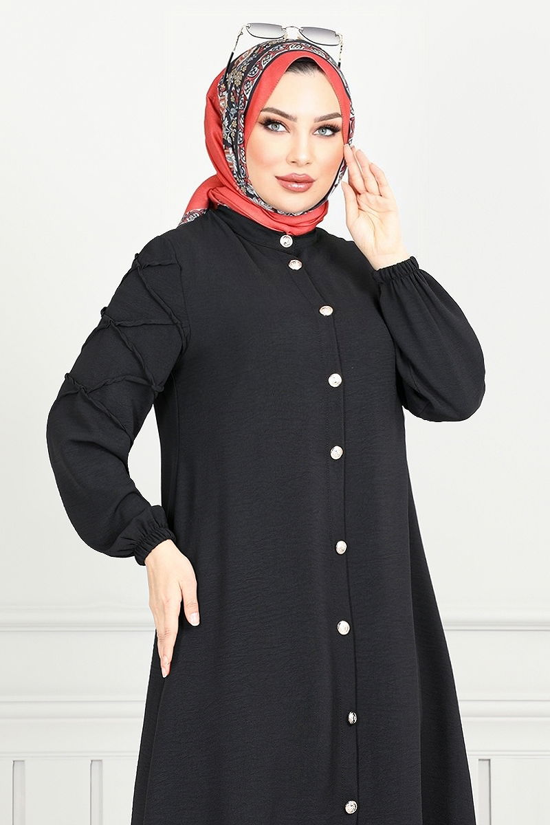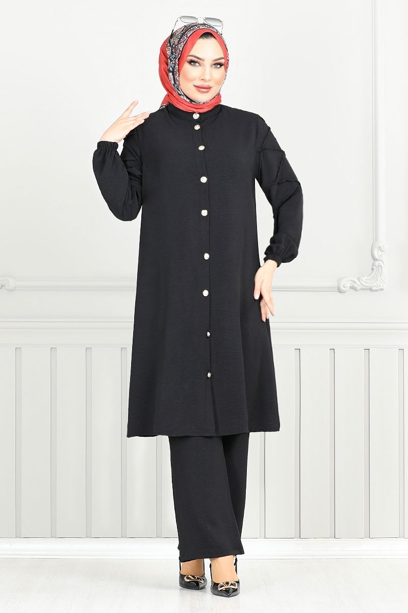 The innovative and stylish Front-Buttoned Aerobin Suit COMBINATION offers comfort and elegance together throughout all seasons. Made from delicate aerobin fabric, this hijab suit is designed to be washed at 30 degrees on a gentle cycle. With a semi-mandarin collar and front-button design, it provides a contemporary look while its lining-free structure and elastic waist pants ensure maximum comfort. Ideal for creating a unique style in any setting.