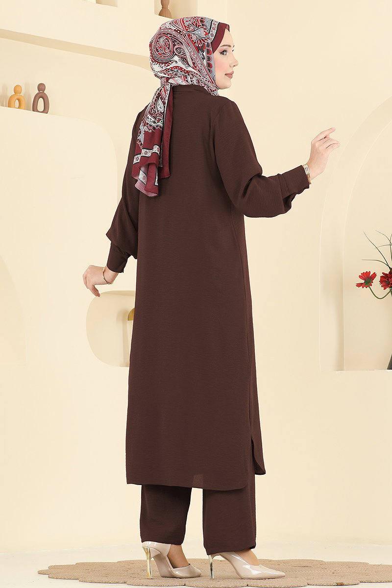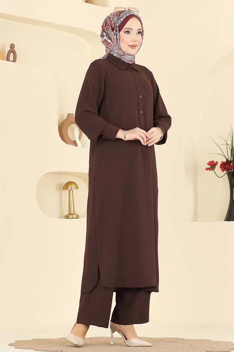 The Shirt Collar Aerobin Suit COMBO is specially designed for modest wear. Suitable for all seasons, this item can be washed delicately at 30 degrees. Made from light and breathable aerobin fabric, it adds elegance with its shirt collar design while offering practicality with its half-buttoned front. The unlined design ensures a comfortable experience, and the elastic waistband on the pants increases your comfort. The active buttons on the cuffs of the tunic and pants add functionality. The product shown on the model is size 38.