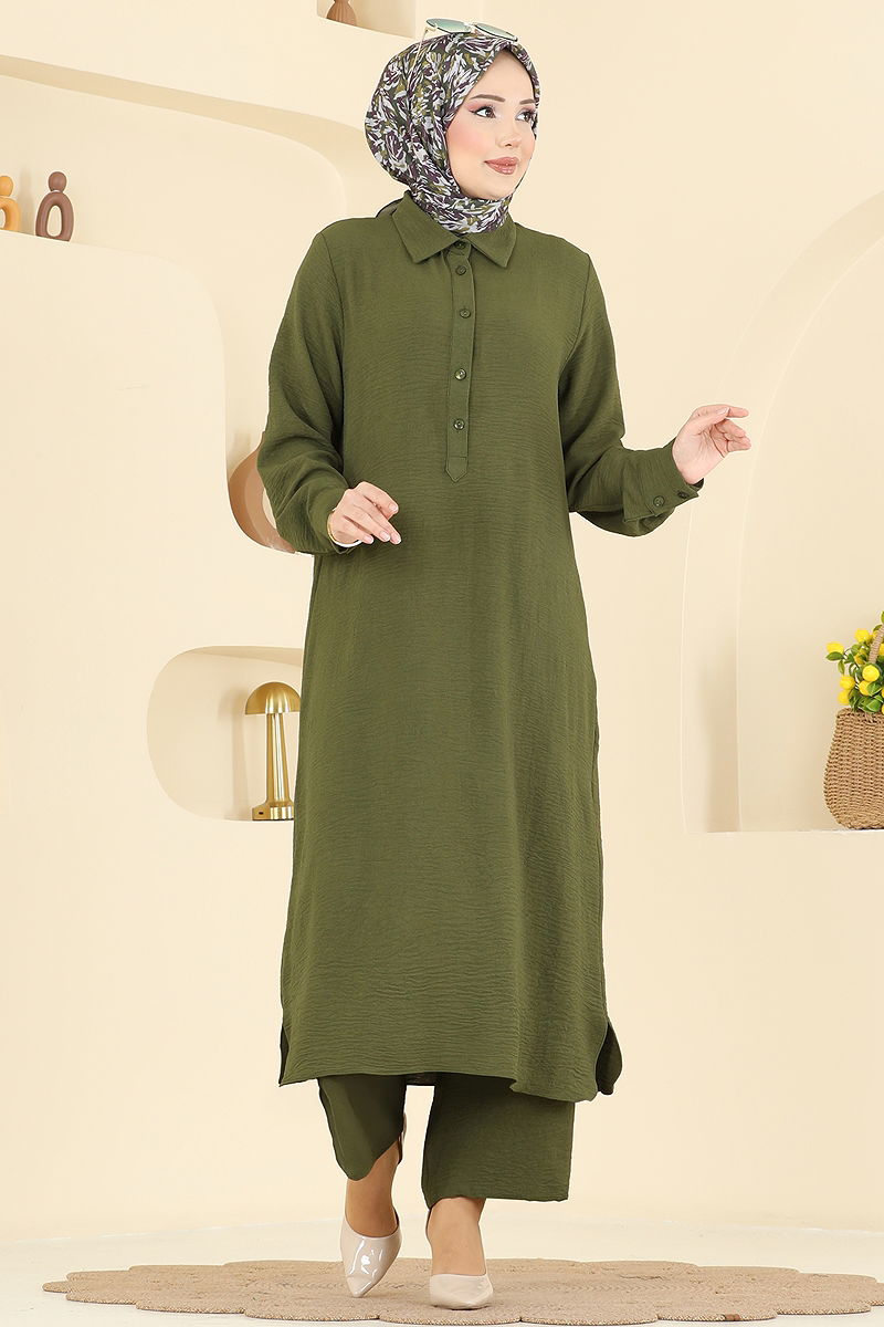The Shirt Collar Aerobin Suit COMBO is specially designed for modest wear. Suitable for all seasons, this item can be washed delicately at 30 degrees. Made from light and breathable aerobin fabric, it adds elegance with its shirt collar design while offering practicality with its half-buttoned front. The unlined design ensures a comfortable experience, and the elastic waistband on the pants increases your comfort. The active buttons on the cuffs of the tunic and pants add functionality. The product shown on the model is size 38.
