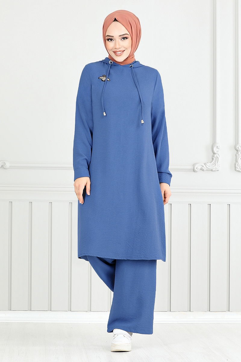 The Arm Detail Twin Set is a modern and elegant Islamic fashion combo suitable for all seasons. This special design can be washed gently at 30 degrees and is made from breathable aerobin fabric. Featuring a hooded neckline and a slit on the side of the tunic, this set stands out with its applique details. The pants have an elastic waist for comfortable wear. This elegant twin set is a versatile option for any size and taste.