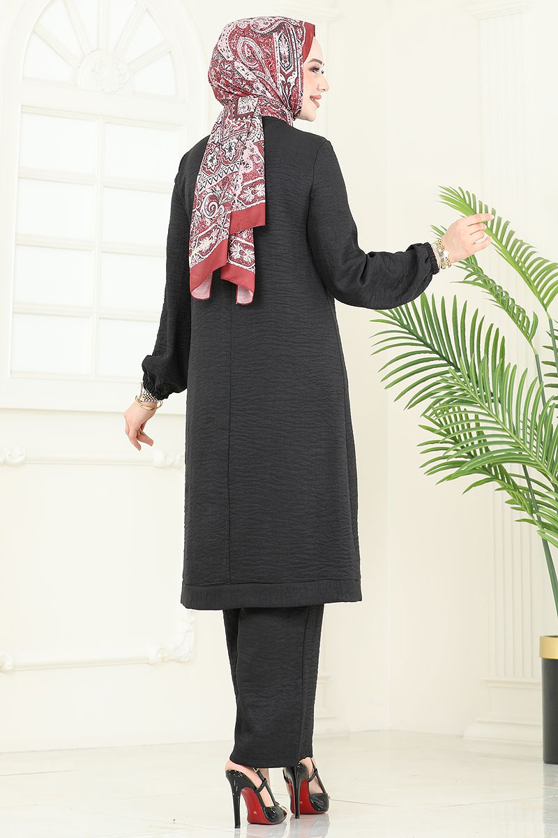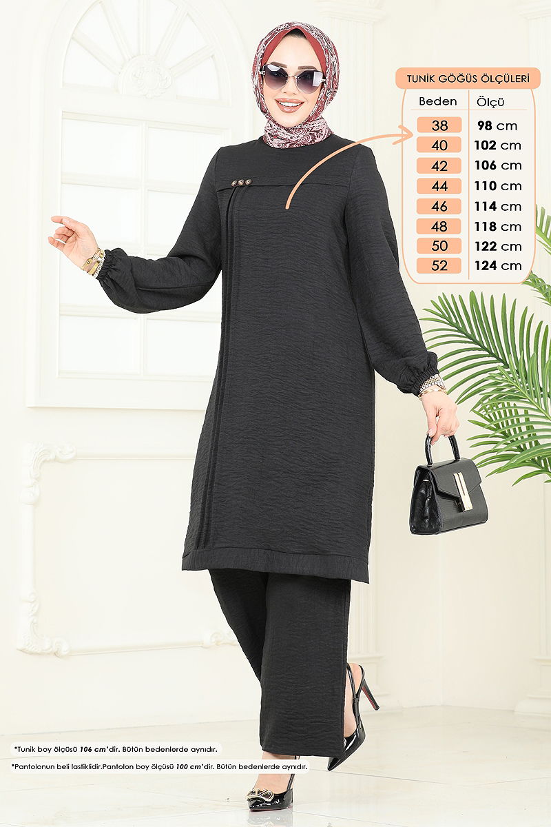 Our Accessory-Buttoned Linen Suit model is a sophisticated design that offers comfort and elegance together for all seasons. This modest wear, which can be washed at 30 degrees on a gentle cycle, is made from Sofia linen fabric. It offers a comfortable fit with its crew neck design and unlined structure. The tunic is 165 cm long, has a chest circumference of 88 cm, waist of 68 cm, hips of 99 cm, and is ideal for individuals weighing 56 kg. The product features a chic button detail at the back suitable for use and decorative buttons. The waist of the pants is elastic for comfortable wear, and both the tunic and pants have elastic cuffs, providing freedom of movement.