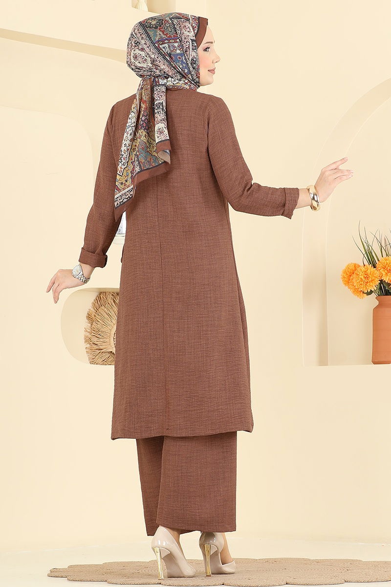 The Accessorized Buttoned Linen Suit COMBINE is a modest wear product that can be comfortably used in all seasons. Made from sofia linen fabric, this suit can be washed at 30 degrees on a gentle cycle. With a bike neck and unlined design, it adds a modern flair, while the accessorized buttons complete the elegance. The drawstring detail provides flexibility to the product; the drawstring can be used optionally. The pants have an elastic waist and the tunic features pocket details for functionality.